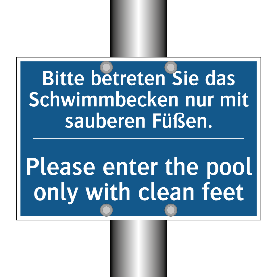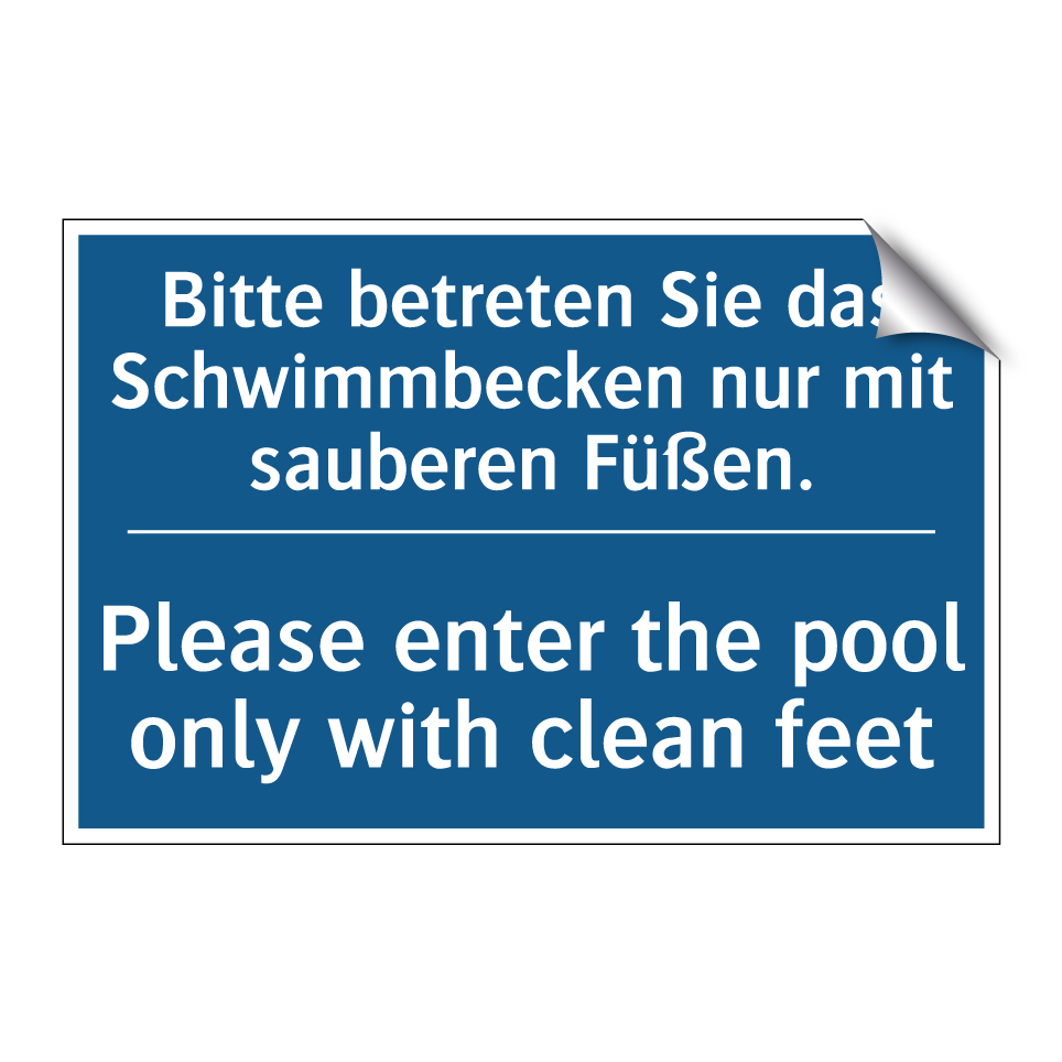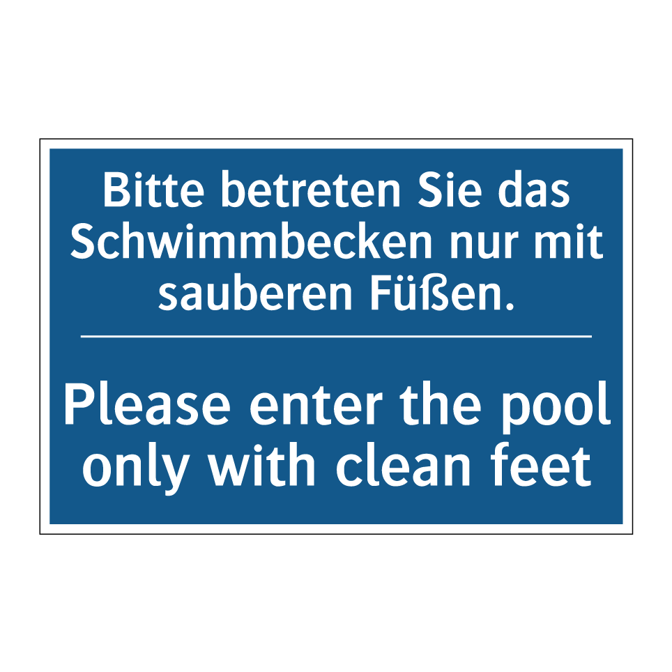 Zweisprachiges Verbotsschild mit deutschem Text Bitte betreten Sie das Schwimmbecken nur mit sauberen Füßen. und englischem Text Please enter the pool only with clean feet