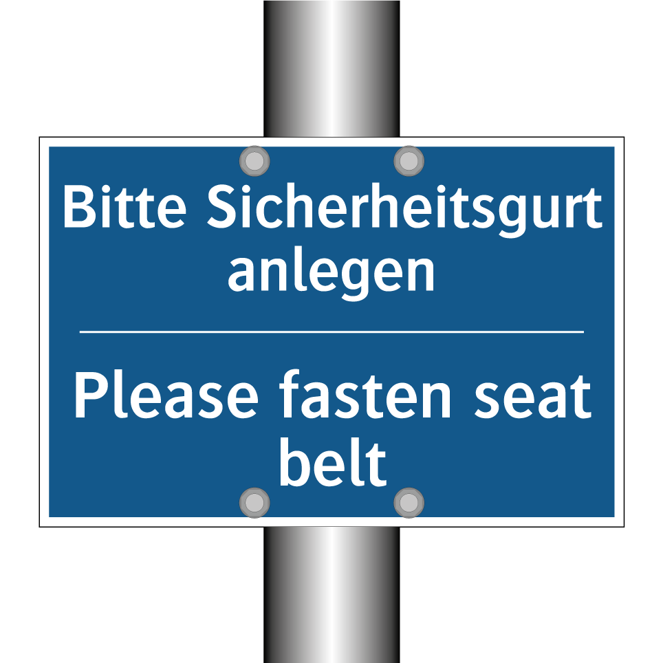 Entdecken Sie die vielseitige Gebotsschild mit zweisprachiger Beschriftung, die sowohl auf Deutsch als auch auf Englisch verfasst ist. Diese aufmerksame Sicherheitsanweisung erinnert daran, den Sicherheitsgurt anzulegen und ist ideal für den Einsatz in Fahrzeugen, Bussen oder Flugzeugen. Die klare blaue Hintergrundfarbe mit weißer Schrift sorgt für eine deutliche Sichtbarkeit und fördert die Sicherheit der Passagiere. Dank der zweisprachigen Gestaltung wird eine breitere Zielgruppe angesprochen, was besonders in internationalen Umgebungen von Vorteil ist. Platzieren Sie diese Gebotsschild an gut sichtbaren Stellen, um die Einhaltung der Sicherheitsvorschriften zu gewährleisten und das Bewusstsein für die Sicherheit zu stärken.