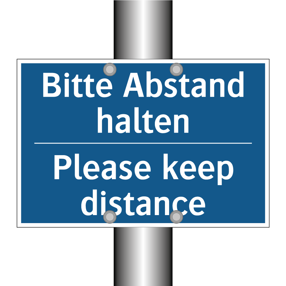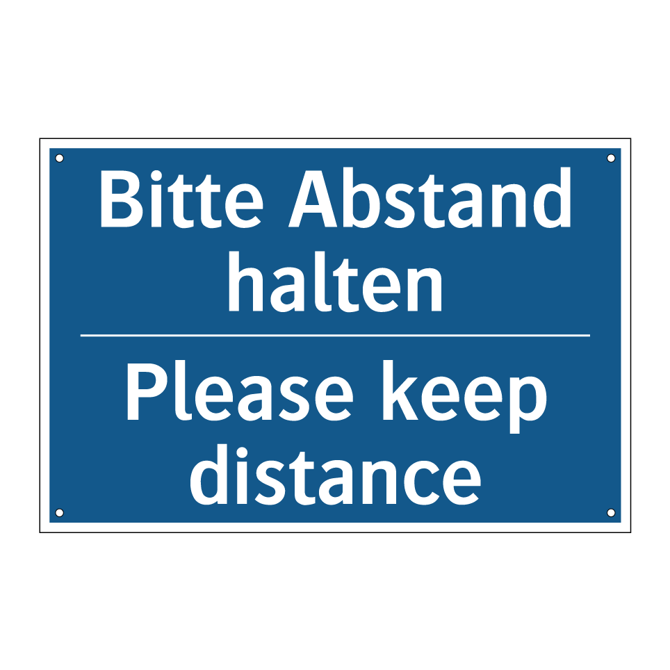 Zweisprachiges Verbotsschild mit deutschem Text Bitte Abstand halten und englischem Text Please keep distance