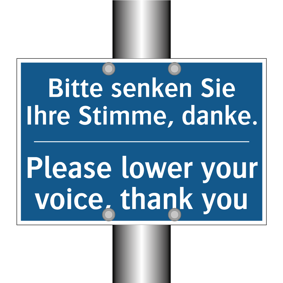 Zweisprachiges Verbotsschild mit deutschem Text Bitte senken Sie Ihre Stimme, danke. und englischem Text Please lower your voice, thank you