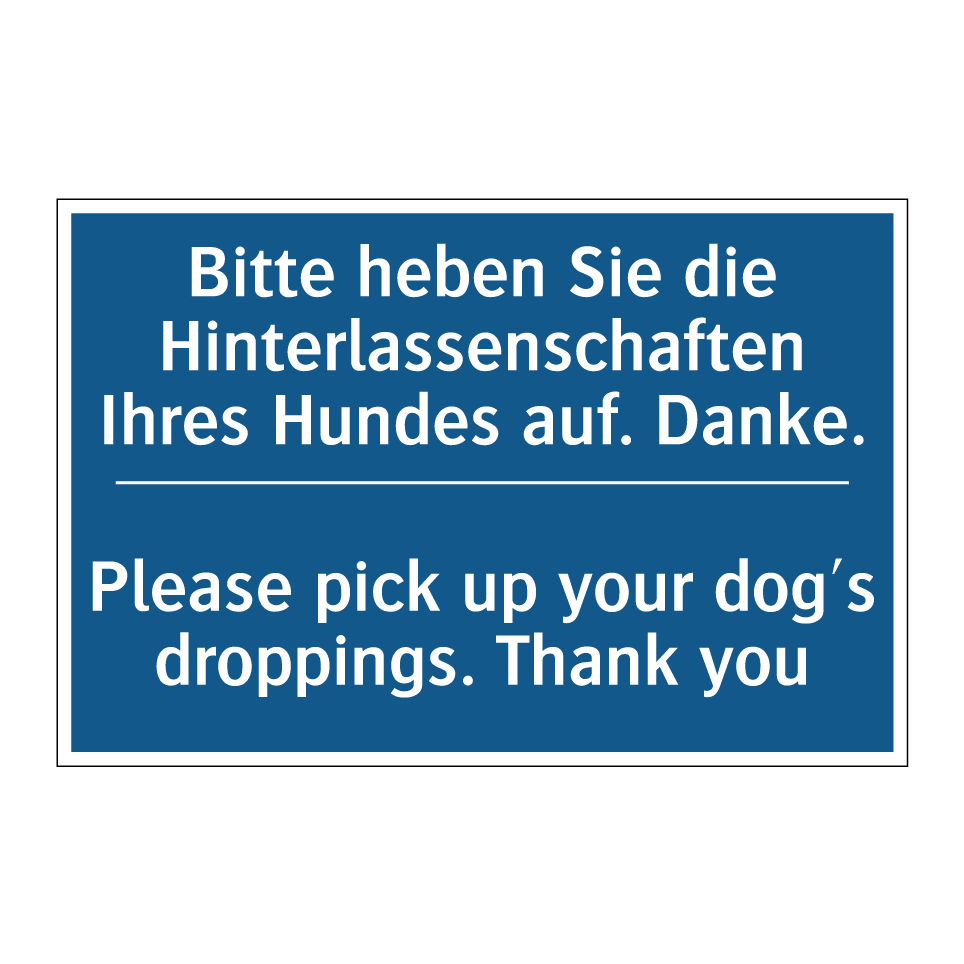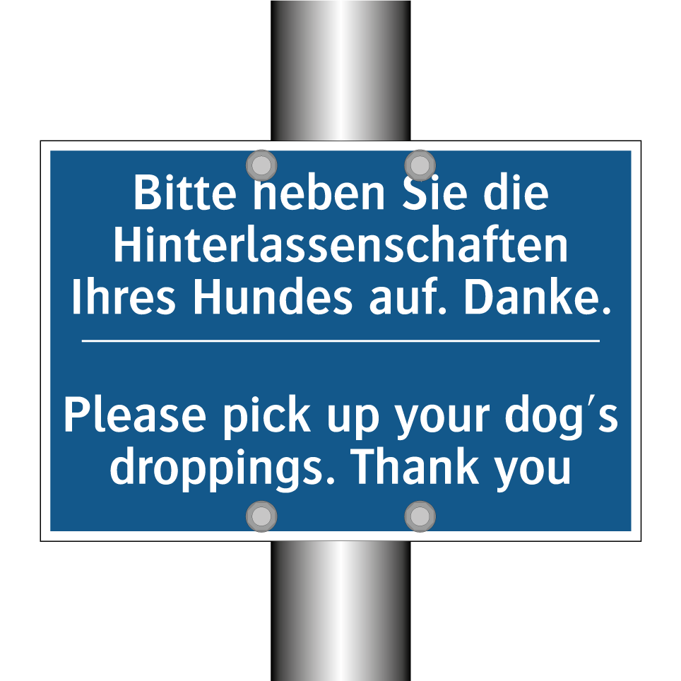 Zweisprachiges Verbotsschild mit deutschem Text Bitte heben Sie die Hinterlassenschaften Ihres Hundes auf. Danke. und englischem Text Please pick up your dog's droppings. Thank you