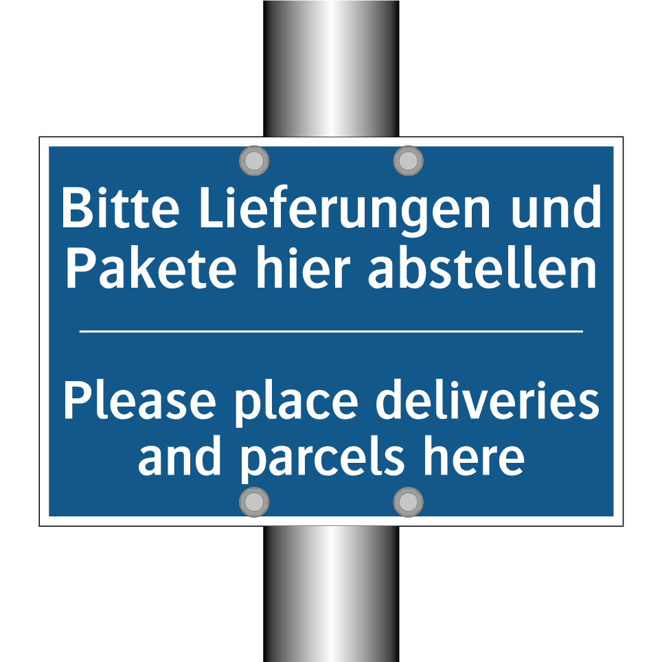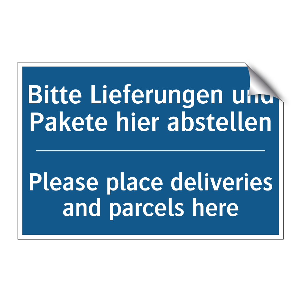 Zweisprachiges Verbotsschild mit deutschem Text Bitte Lieferungen und Pakete hier abstellen und englischem Text Please place deliveries and parcels here