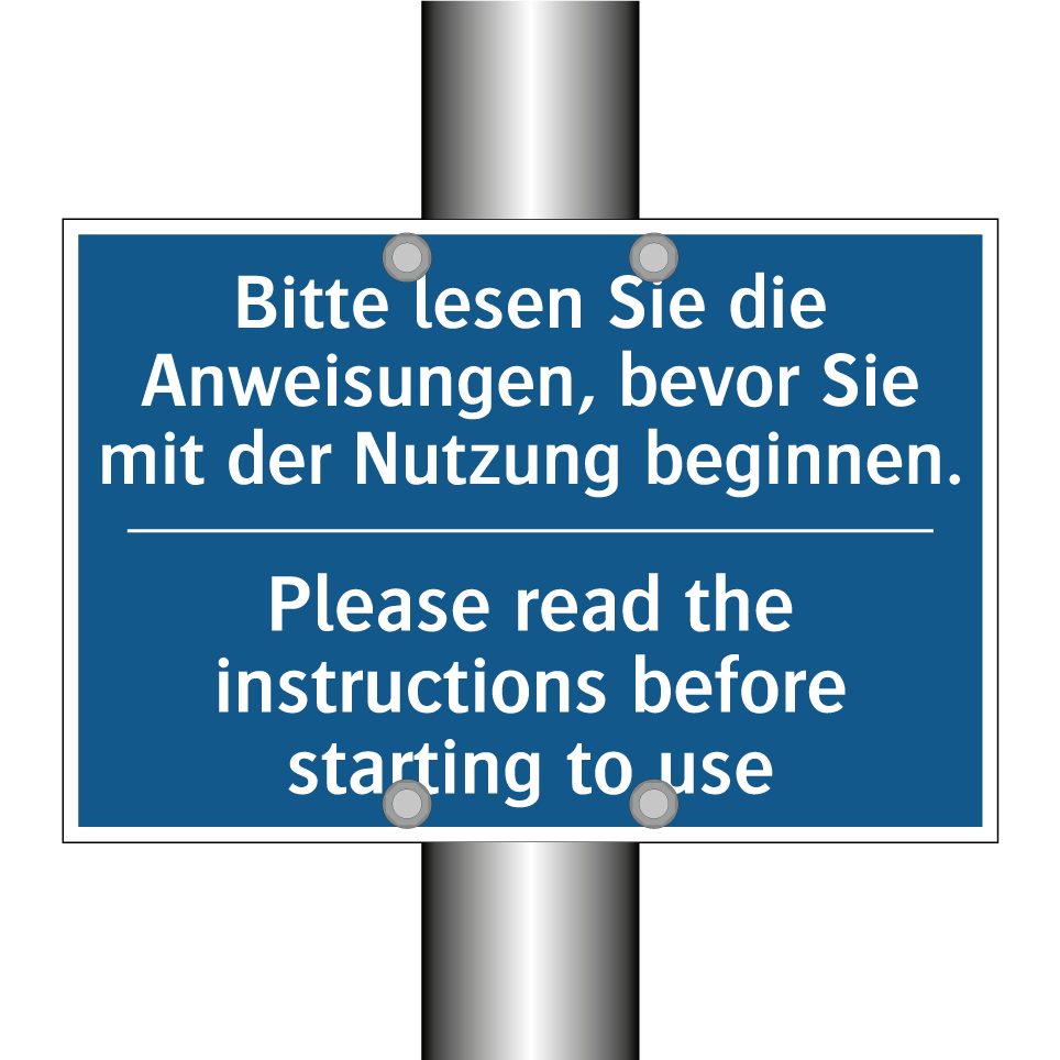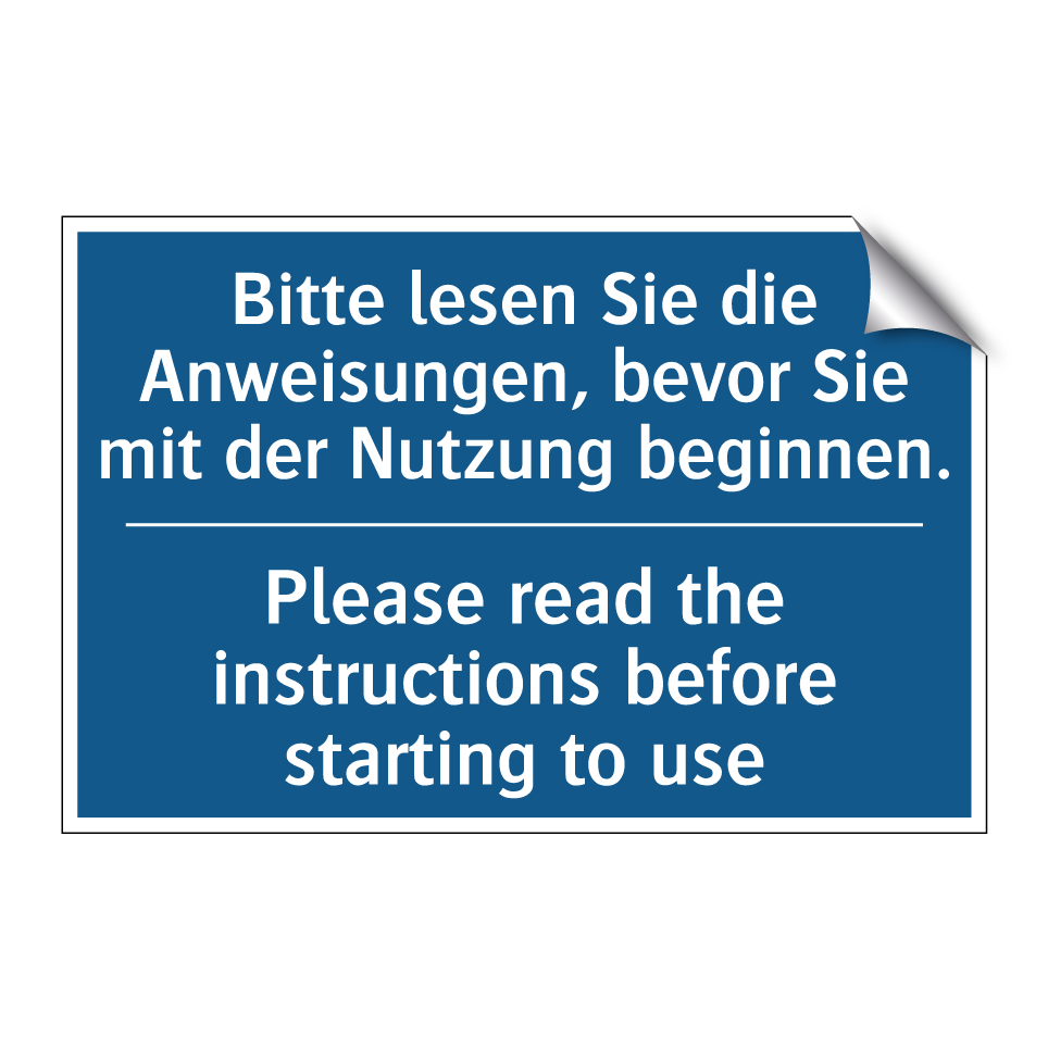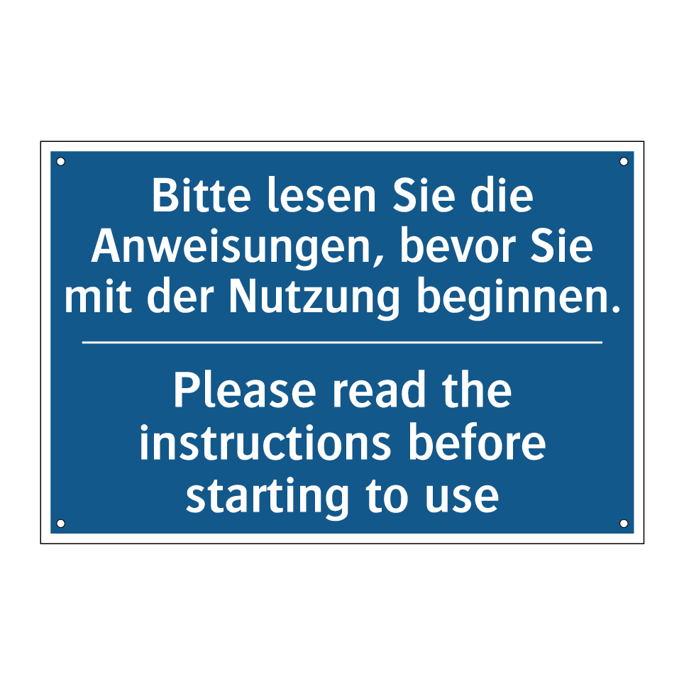 Zweisprachiges Verbotsschild mit deutschem Text Bitte lesen Sie die Anweisungen, bevor Sie mit der Nutzung beginnen. und englischem Text Please read the instructions before starting to use