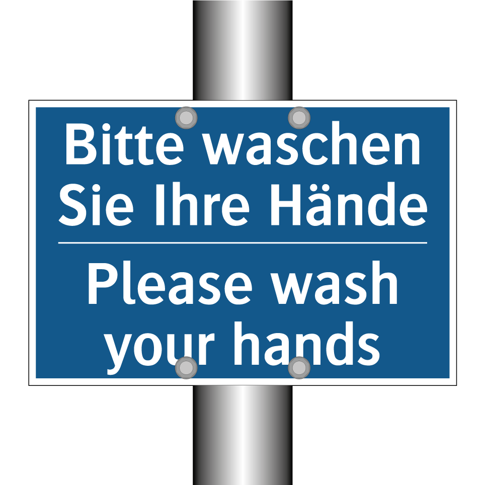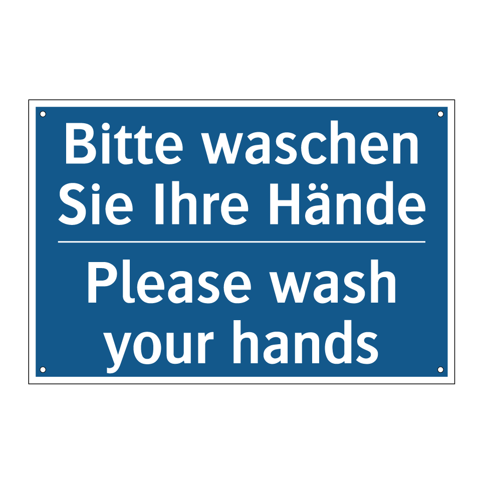 Zweisprachiges Verbotsschild mit deutschem Text Bitte waschen Sie Ihre Hände und englischem Text Please wash your hands