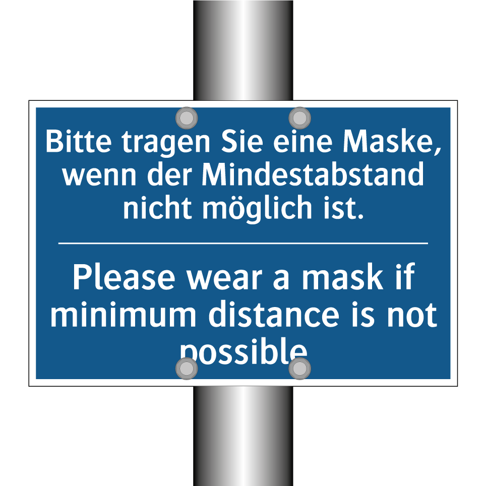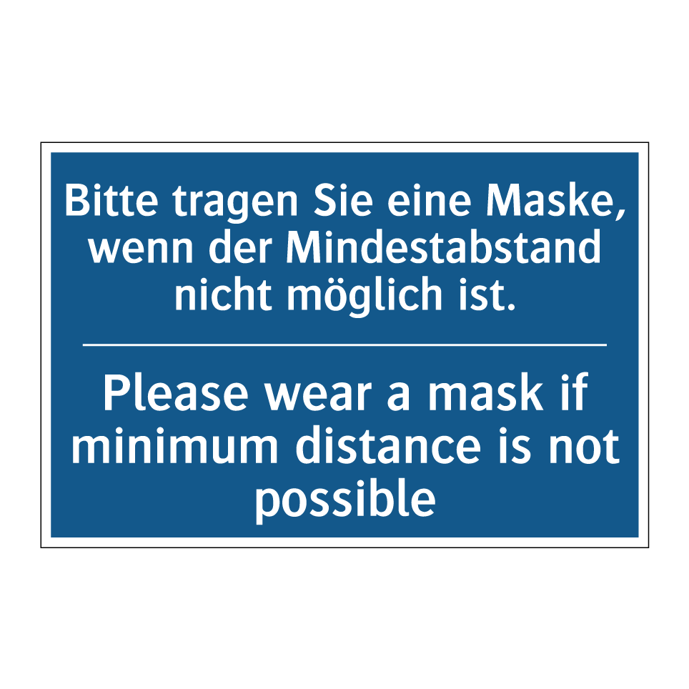 Diese Gebotsschild ist ideal für Orte, an denen das Tragen einer Maske erforderlich ist, wenn der Mindestabstand nicht eingehalten werden kann. Mit ihrer zweisprachigen Beschriftung auf Deutsch und Englisch eignet sie sich hervorragend für internationale Umgebungen wie Flughäfen, Bahnhöfe oder Einkaufszentren. Die klare blaue Hintergrundfarbe mit weißem Text sorgt dafür, dass die Anweisung leicht erkennbar und verständlich ist. Diese Gebotsschild kann an Eingängen, in Wartebereichen oder in stark frequentierten Korridoren angebracht werden, um die Sicherheit und das Wohlbefinden aller zu gewährleisten. Die zweisprachige Gestaltung erhöht die Zugänglichkeit und Verständlichkeit für ein breites Publikum.