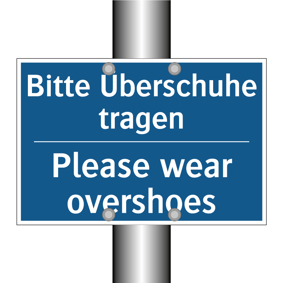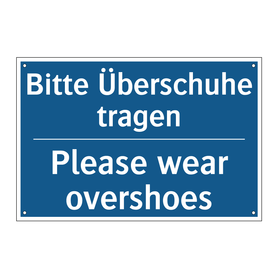 Zweisprachiges Verbotsschild mit deutschem Text Bitte Überschuhe tragen und englischem Text Please wear overshoes