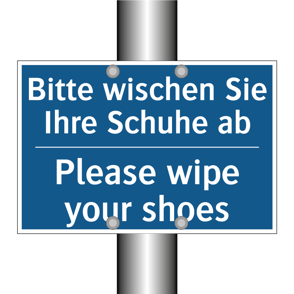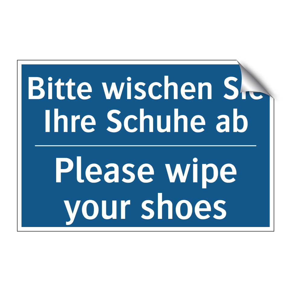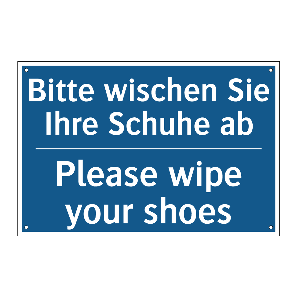 Zweisprachiges Verbotsschild mit deutschem Text Bitte wischen Sie Ihre Schuhe ab und englischem Text Please wipe your shoes
