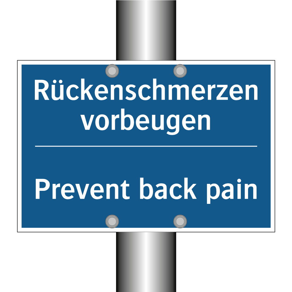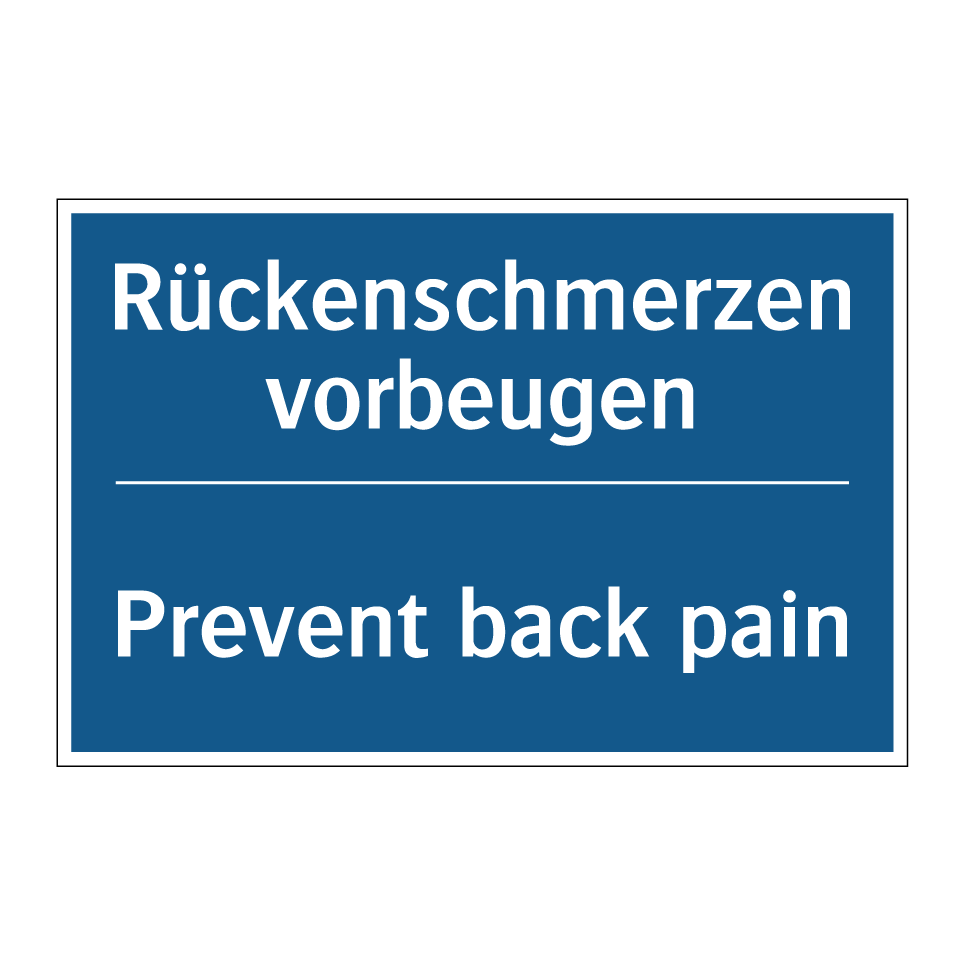 Zweisprachiges Verbotsschild mit deutschem Text Rückenschmerzen vorbeugen und englischem Text Prevent back pain