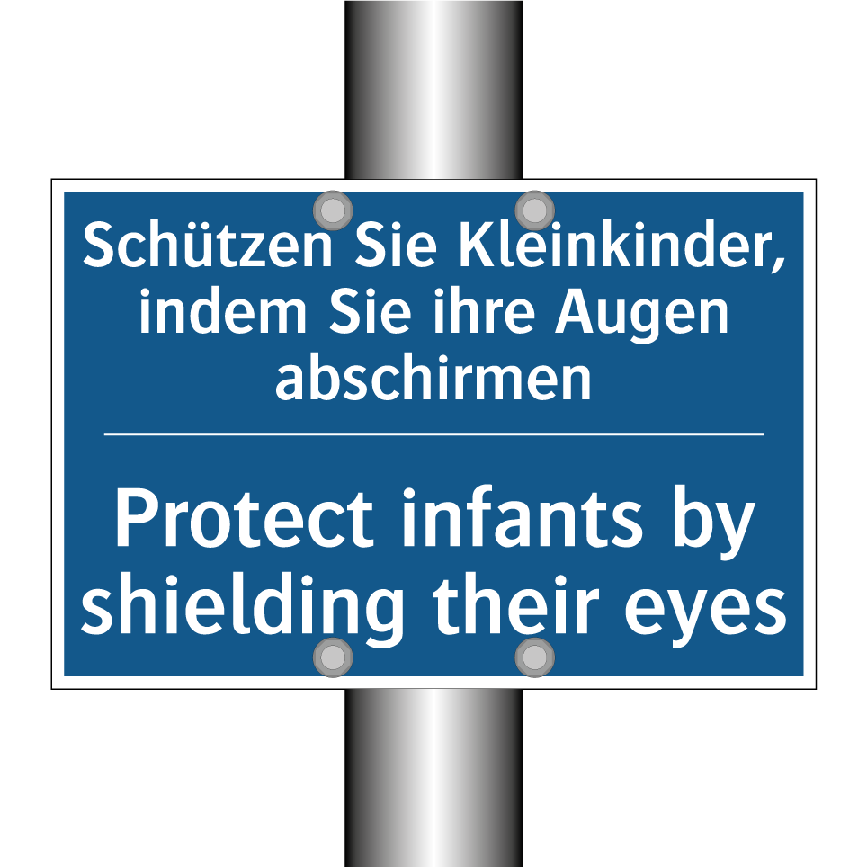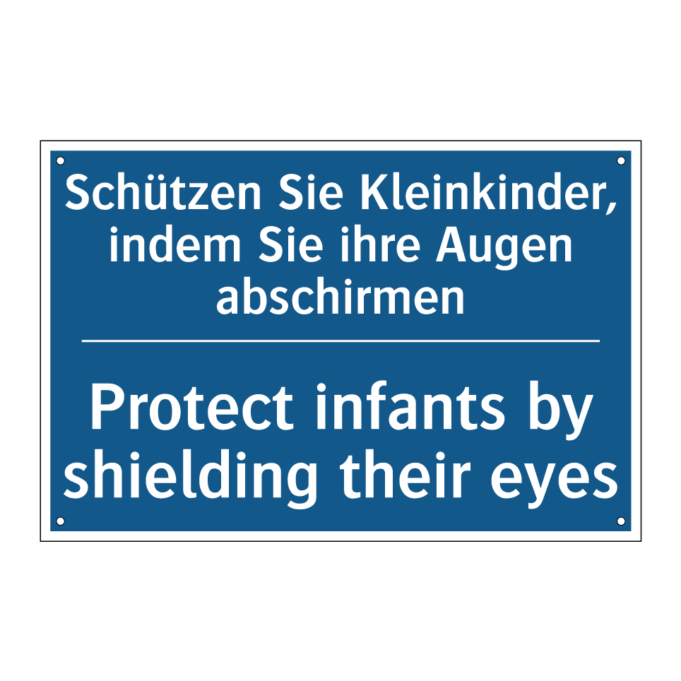 Zweisprachiges Verbotsschild mit deutschem Text Schützen Sie Kleinkinder, indem Sie ihre Augen abschirmen und englischem Text Protect infants by shielding their eyes