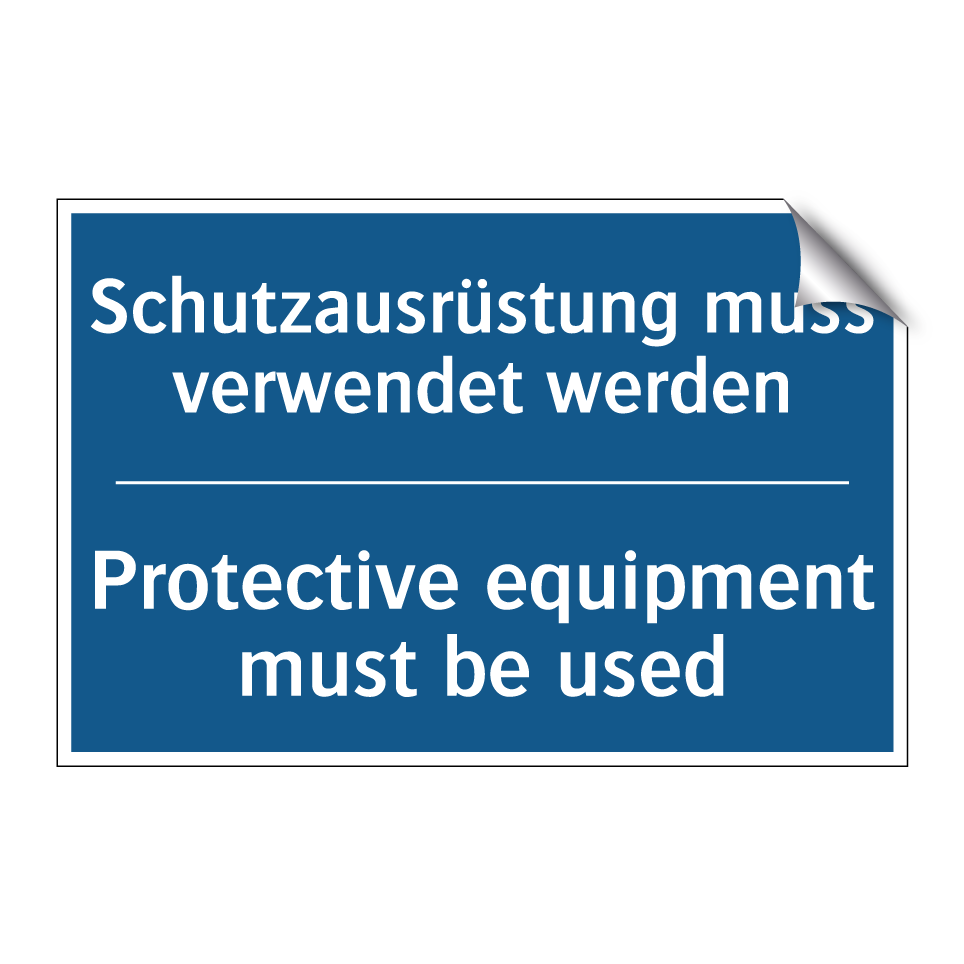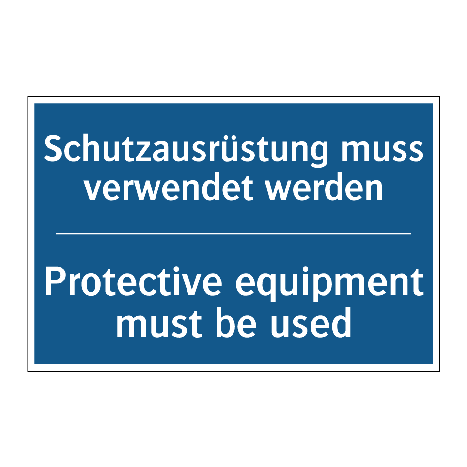 Zweisprachiges Verbotsschild mit deutschem Text Schutzausrüstung muss verwendet werden und englischem Text Protective equipment must be used