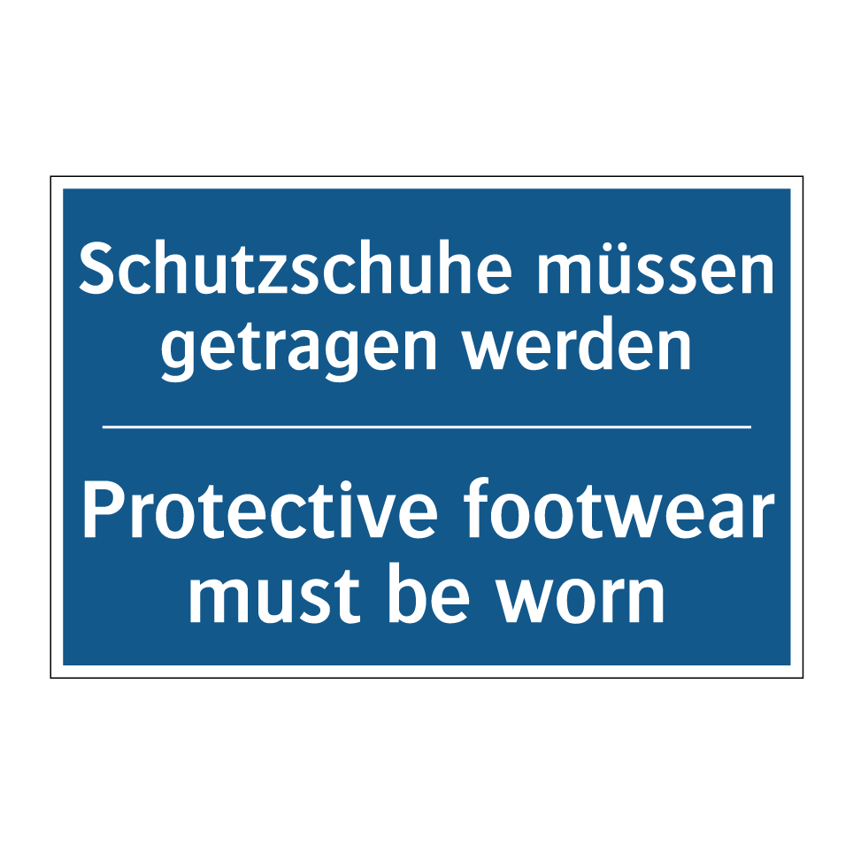 Diese Gebotsschild ist ein unverzichtbares Element für Arbeitsumgebungen, in denen Sicherheit an erster Stelle steht. Mit ihrer klaren blauen Hintergrundfarbe und der deutlichen weißen Schrift erinnert sie daran, dass das Tragen von Schutzschuhen Pflicht ist. Die zweisprachige Beschriftung auf Deutsch und Englisch macht sie ideal für internationale Arbeitsplätze und fördert das Verständnis bei einem vielfältigen Team. Diese Sicherheitsanweisung kann in Fabriken, Baustellen, Lagerhäusern oder anderen industriellen Bereichen angebracht werden, um die Einhaltung von Sicherheitsvorschriften zu gewährleisten. Durch die strategische Platzierung an Eingängen oder in Umkleideräumen wird sichergestellt, dass alle Mitarbeiter die wichtige Botschaft wahrnehmen.