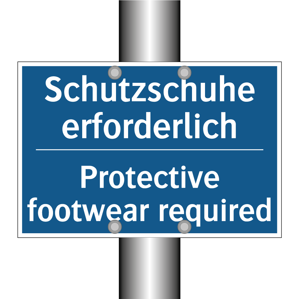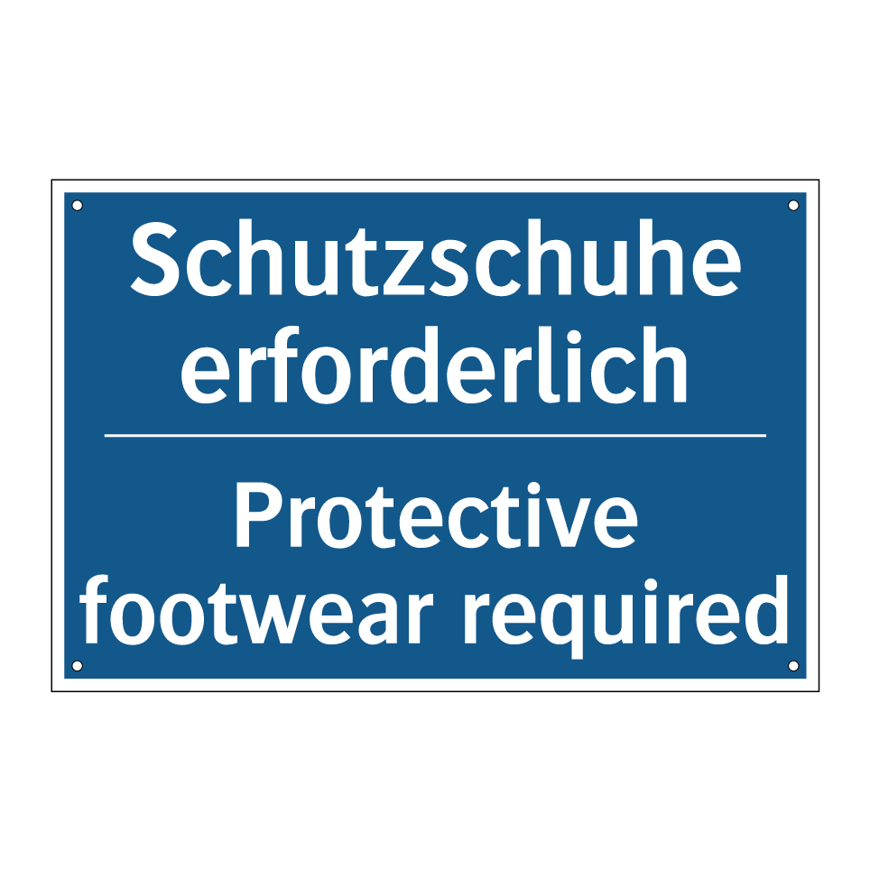 Zweisprachiges Verbotsschild mit deutschem Text Schutzschuhe erforderlich und englischem Text Protective footwear required