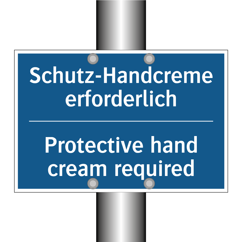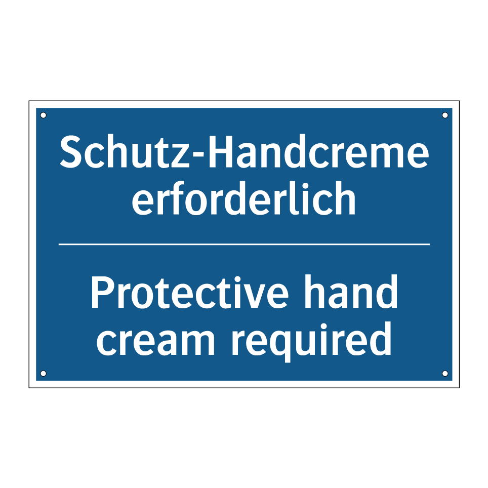Zweisprachiges Verbotsschild mit deutschem Text Schutz-Handcreme erforderlich und englischem Text Protective hand cream required