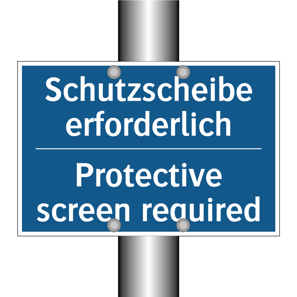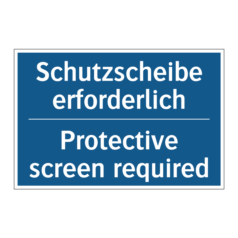 Zweisprachiges Verbotsschild mit deutschem Text Schutzscheibe erforderlich und englischem Text Protective screen required