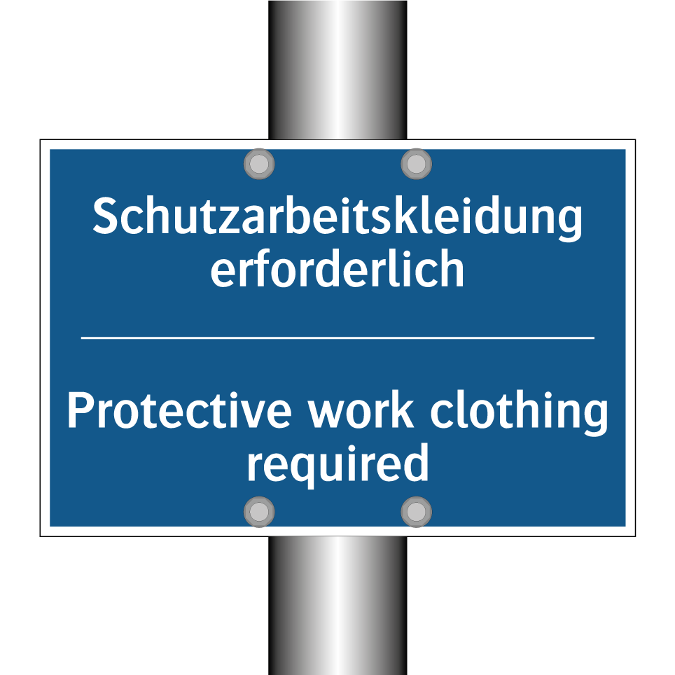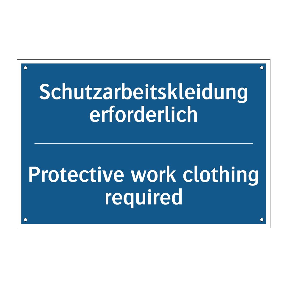 Zweisprachiges Verbotsschild mit deutschem Text Schutzarbeitskleidung erforderlich und englischem Text Protective work clothing required
