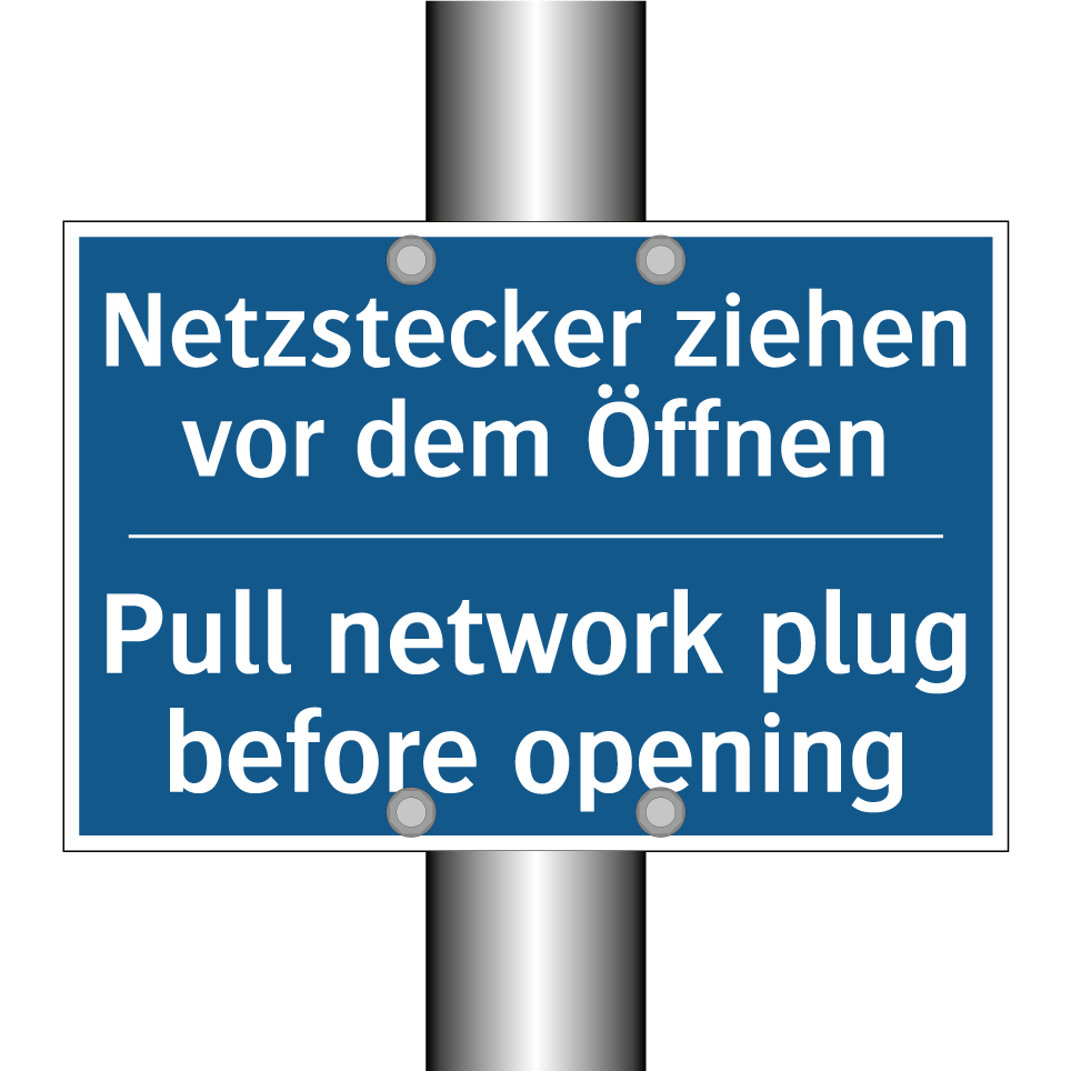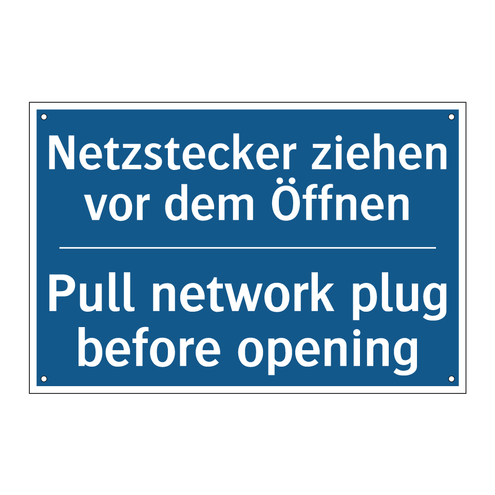 Zweisprachiges Verbotsschild mit deutschem Text Netzstecker ziehen vor dem Öffnen und englischem Text Pull network plug before opening