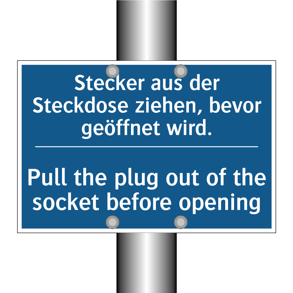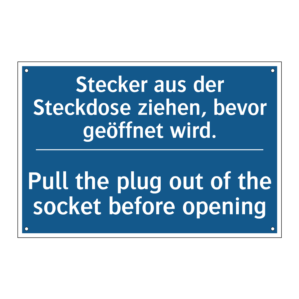 Zweisprachiges Verbotsschild mit deutschem Text Stecker aus der Steckdose ziehen, bevor geöffnet wird. und englischem Text Pull the plug out of the socket before opening