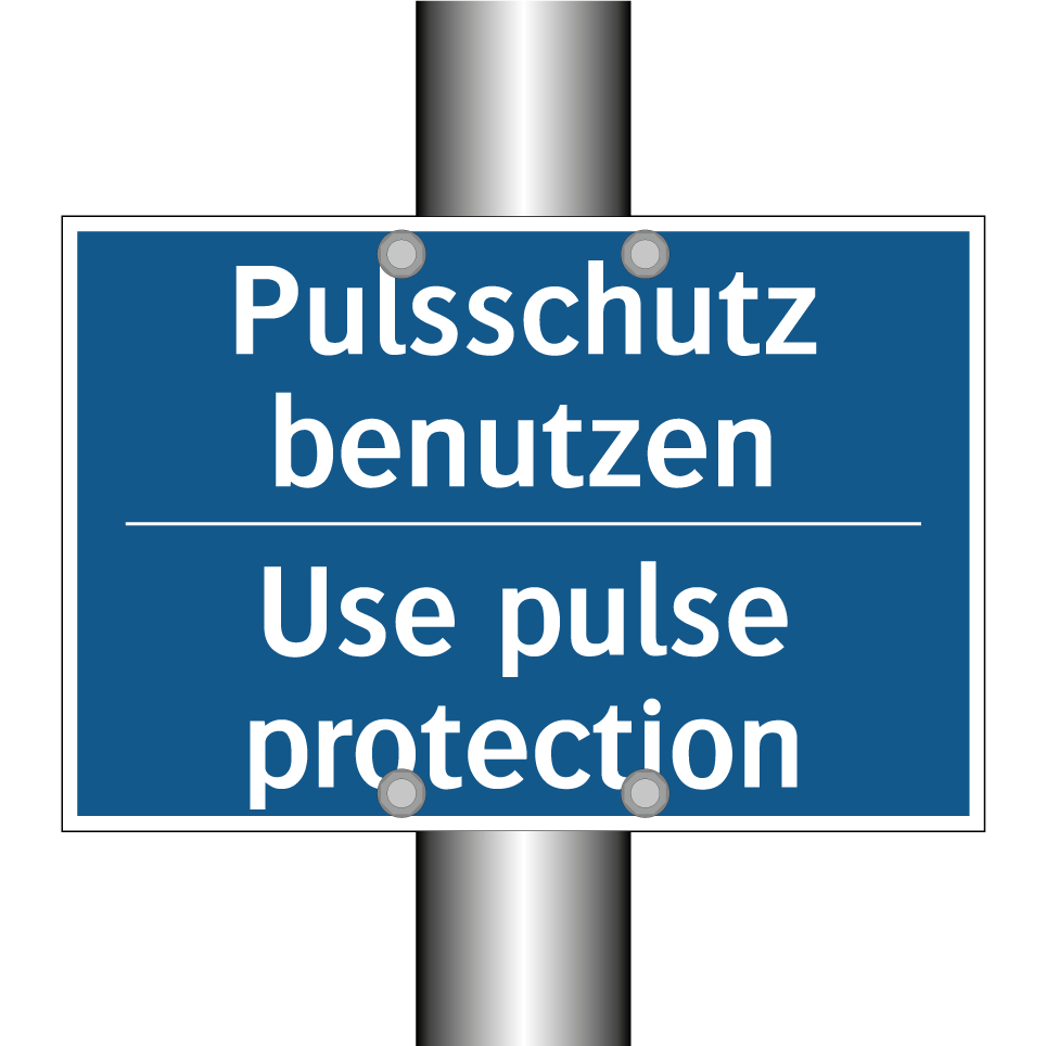 Zweisprachiges Verbotsschild mit deutschem Text Pulsschutz benutzen und englischem Text Use pulse protection