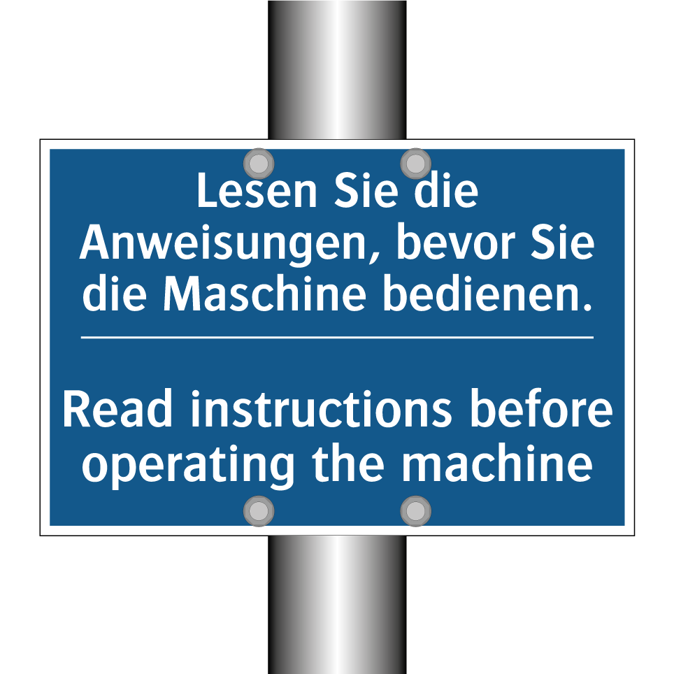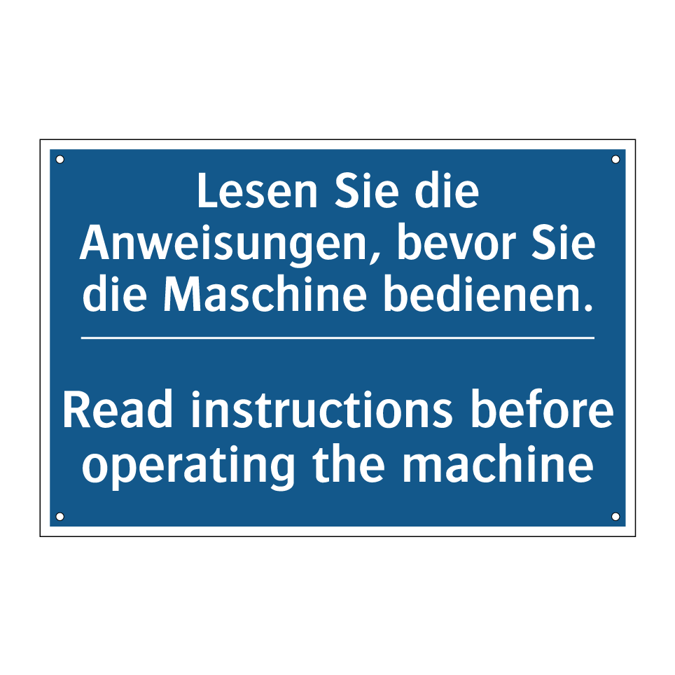 Zweisprachiges Verbotsschild mit deutschem Text Lesen Sie die Anweisungen, bevor Sie die Maschine bedienen. und englischem Text Read instructions before operating the machine