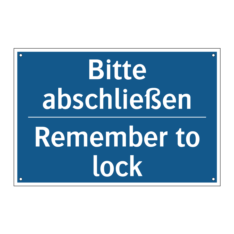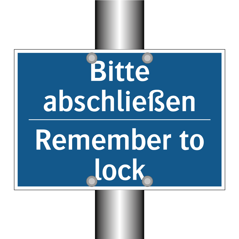 Zweisprachiges Verbotsschild mit deutschem Text Bitte abschließen und englischem Text Remember to lock