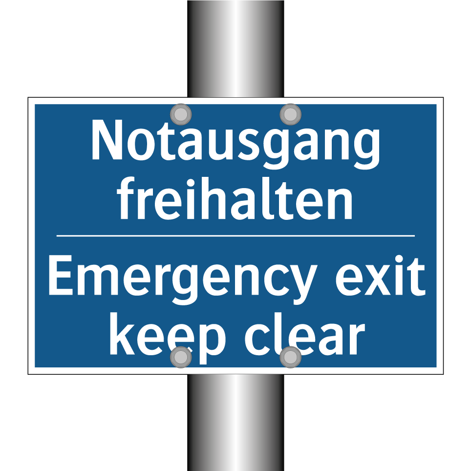 Zweisprachiges Verbotsschild mit deutschem Text Notausgang freihalten und englischem Text Emergency exit keep clear