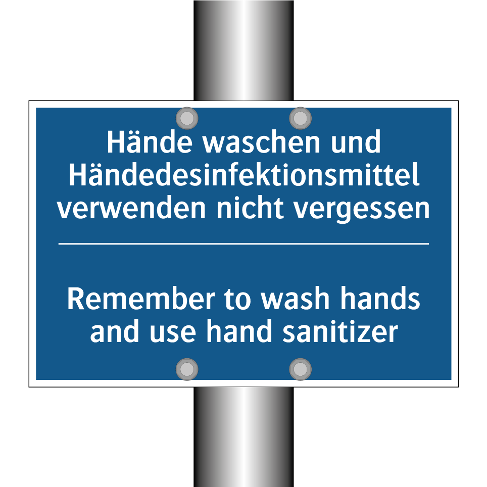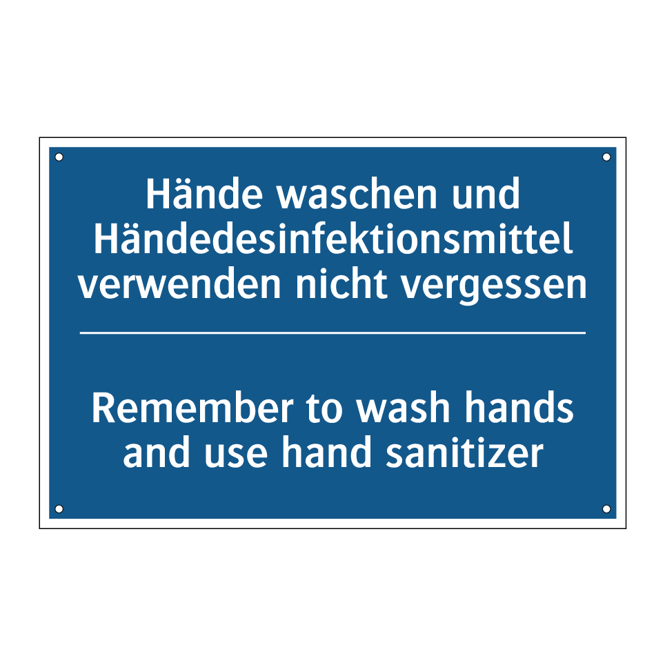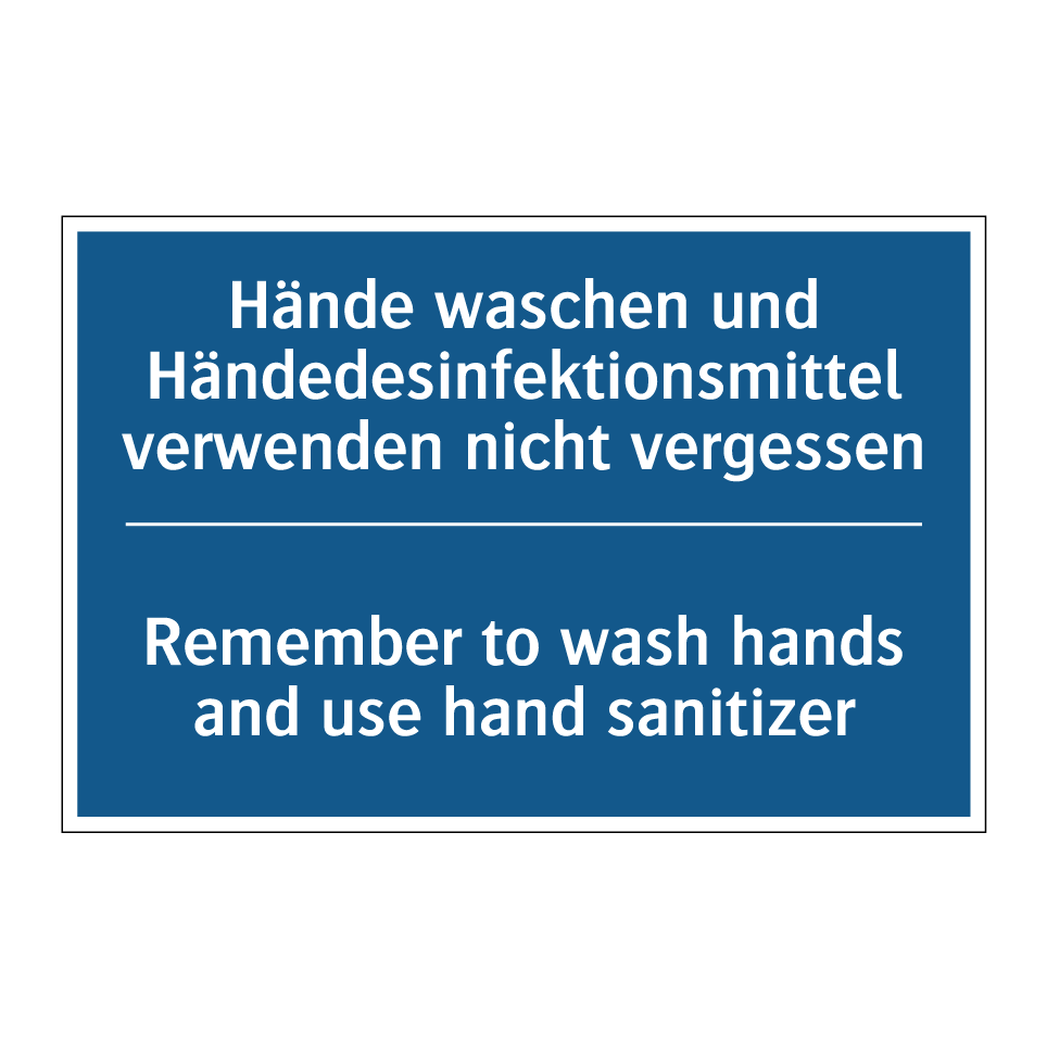 Zweisprachiges Verbotsschild mit deutschem Text Hände waschen und Händedesinfektionsmittel verwenden nicht vergessen und englischem Text Remember to wash hands and use hand sanitizer