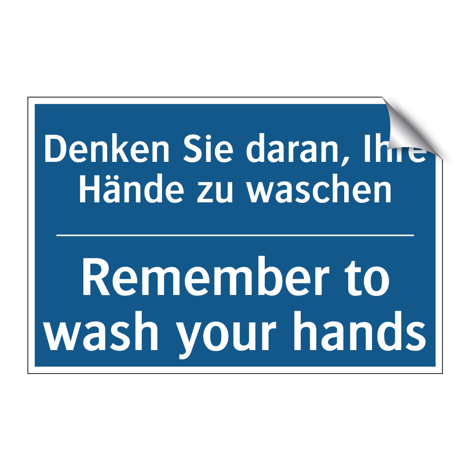 Zweisprachiges Verbotsschild mit deutschem Text Denken Sie daran, Ihre Hände zu waschen und englischem Text Remember to wash your hands