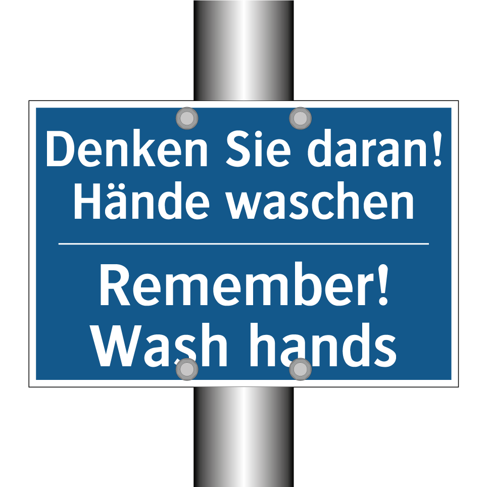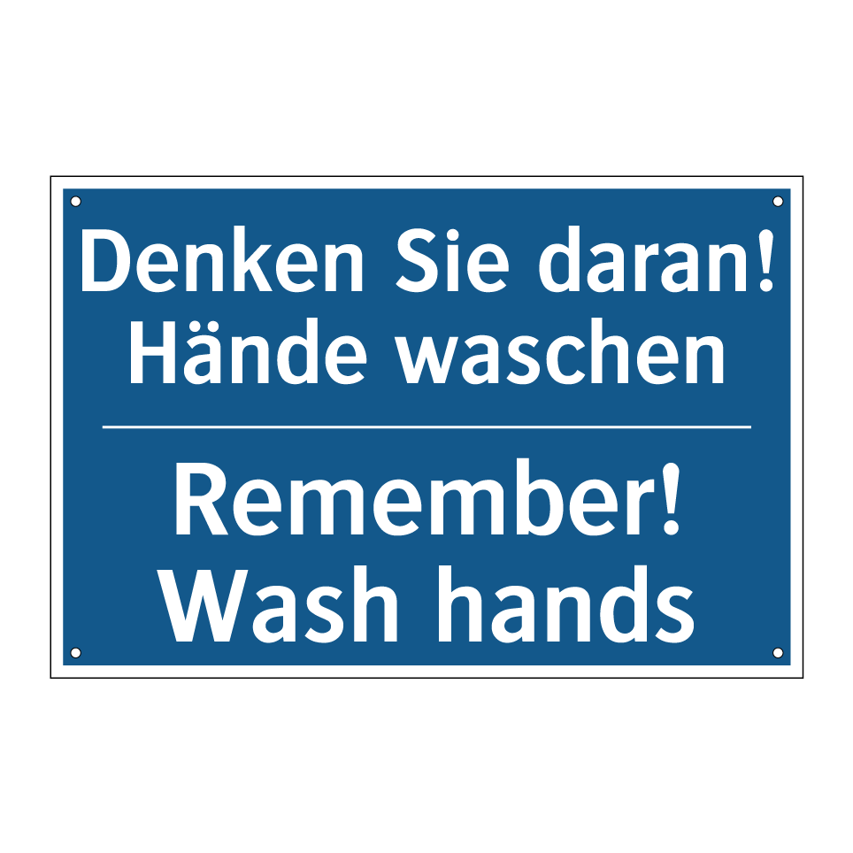 Zweisprachiges Verbotsschild mit deutschem Text Denken Sie daran! Hände waschen und englischem Text Remember! Wash hands