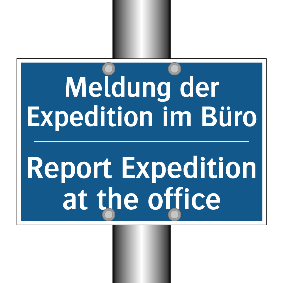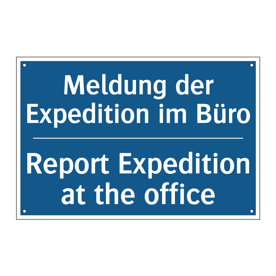 Zweisprachiges Verbotsschild mit deutschem Text Meldung der Expedition im Büro und englischem Text Report Expedition at the office