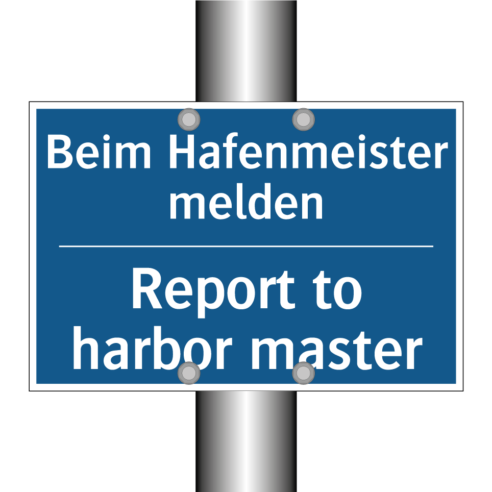 Zweisprachiges Verbotsschild mit deutschem Text Beim Hafenmeister melden und englischem Text Report to harbor master
