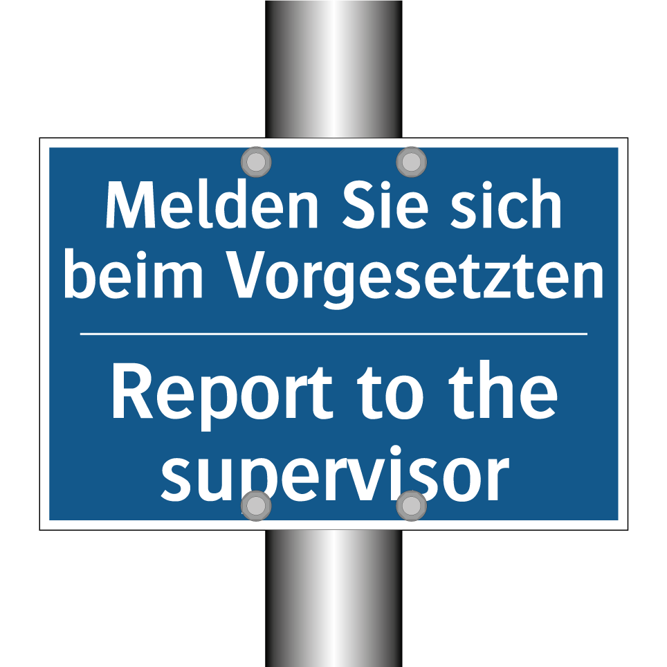 Entdecken Sie die Vielseitigkeit dieser Gebotsschild, die sowohl auf Deutsch als auch auf Englisch gestaltet ist. Diese zweisprachige Beschilderung ist ideal für internationale Arbeitsumgebungen, in denen klare Kommunikation entscheidend ist. Sie dient dazu, Mitarbeiter und Besucher darauf hinzuweisen, sich bei ihrem Vorgesetzten zu melden, was die Sicherheit und den reibungslosen Ablauf in Ihrem Betrieb fördert. Platzieren Sie diese Gebotsschild an strategischen Punkten wie Eingängen, Empfangsbereichen oder in der Nähe von Büros, um sicherzustellen, dass die Anweisungen leicht sichtbar und verständlich sind. Die Verwendung von zwei Sprachen erhöht die Zugänglichkeit und minimiert Missverständnisse, was besonders in multikulturellen Teams von Vorteil ist.