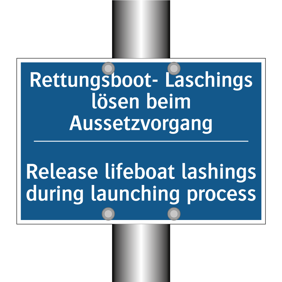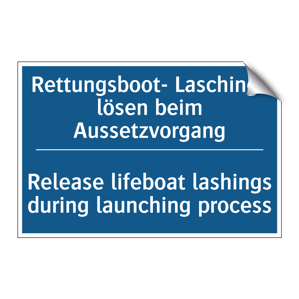 Zweisprachiges Verbotsschild mit deutschem Text Rettungsboot- Laschings lösen beim Aussetzvorgang und englischem Text Release lifeboat lashings during launching process