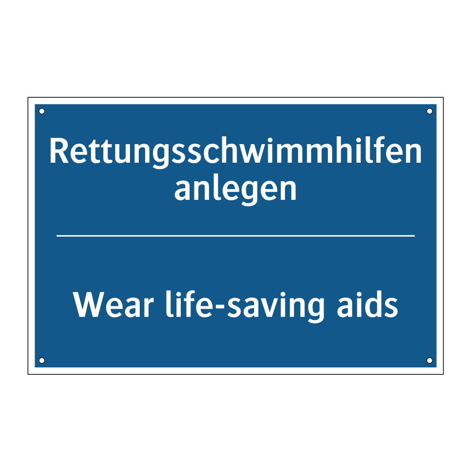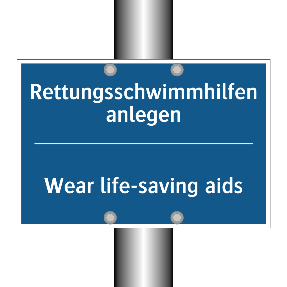 Zweisprachiges Verbotsschild mit deutschem Text Rettungsschwimmhilfen anlegen und englischem Text Wear life-saving aids