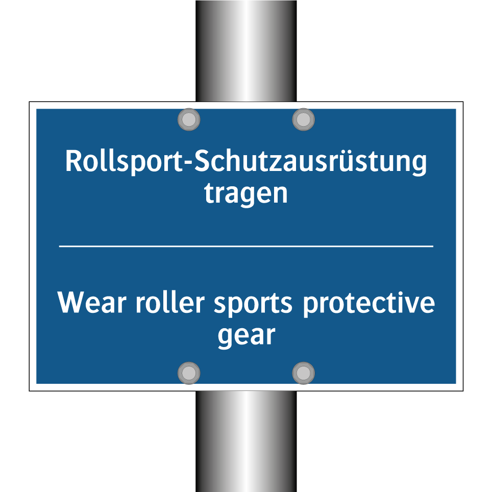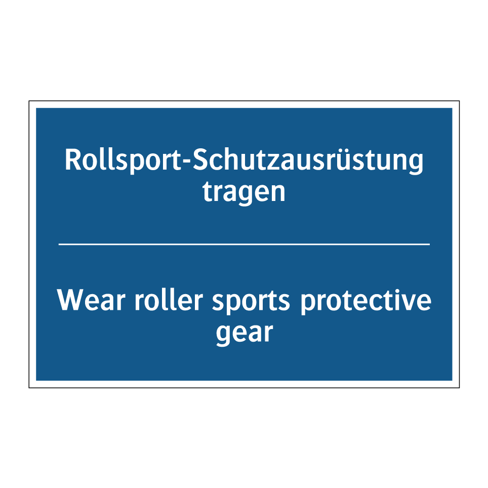 Zweisprachiges Verbotsschild mit deutschem Text Rollsport-Schutzausrüstung tragen und englischem Text Wear roller sports protective gear