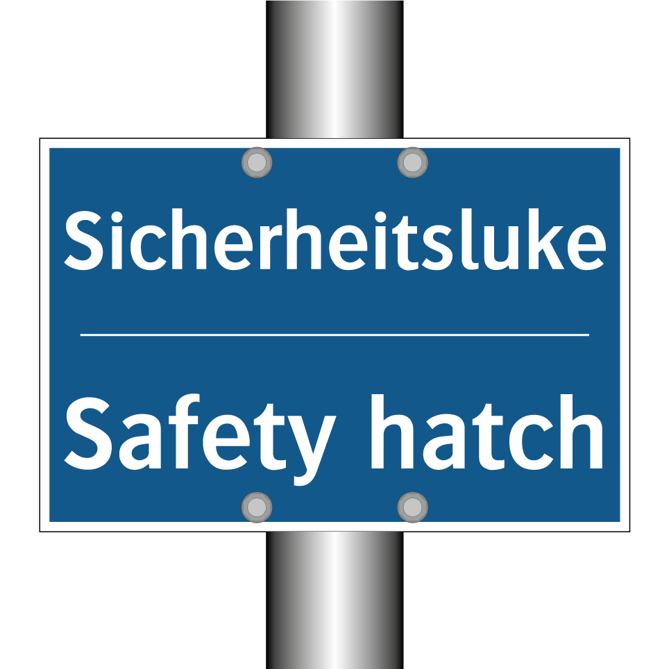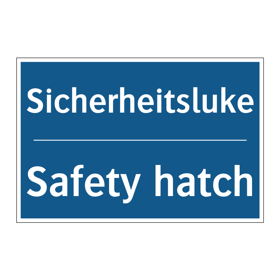 Zweisprachiges Verbotsschild mit deutschem Text Sicherheitsluke und englischem Text Safety hatch