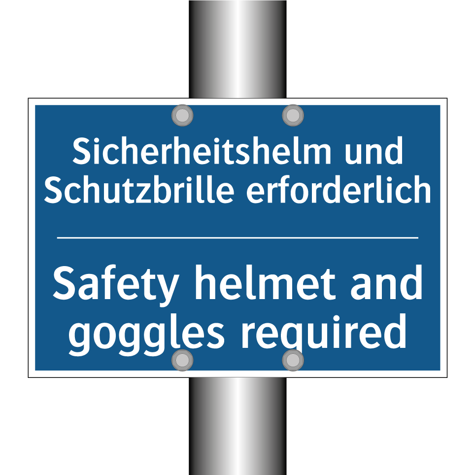 Zweisprachiges Verbotsschild mit deutschem Text Sicherheitshelm und Schutzbrille erforderlich und englischem Text Safety helmet and goggles required