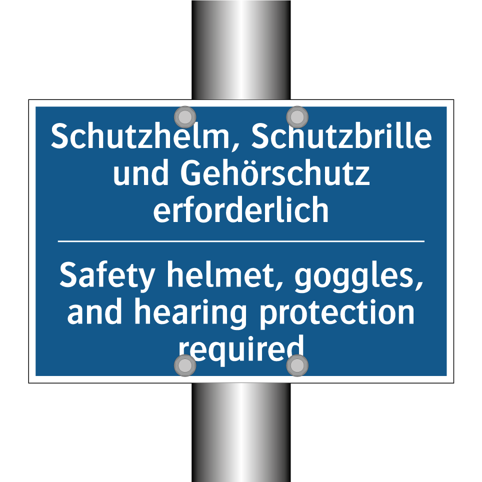 Zweisprachiges Verbotsschild mit deutschem Text Schutzhelm, Schutzbrille und Gehörschutz erforderlich und englischem Text Safety helmet, goggles, and hearing protection required