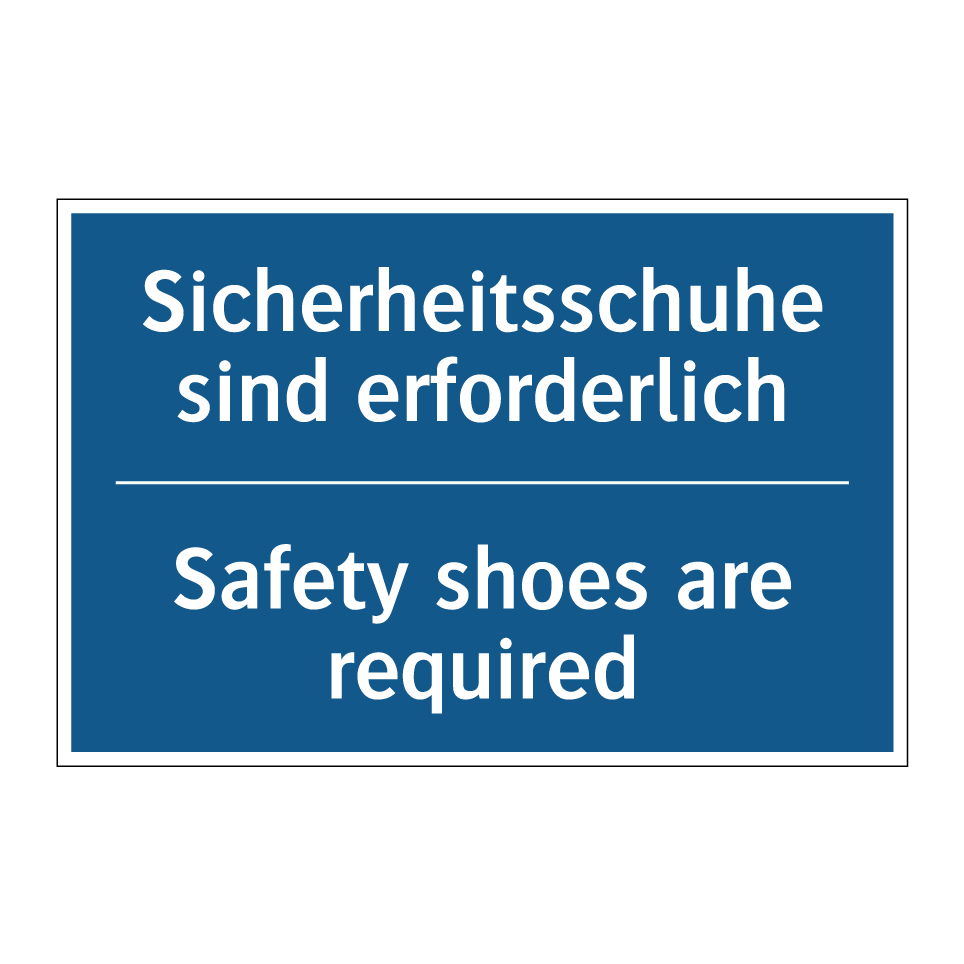 Zweisprachiges Verbotsschild mit deutschem Text Sicherheitsschuhe sind erforderlich und englischem Text Safety shoes are required