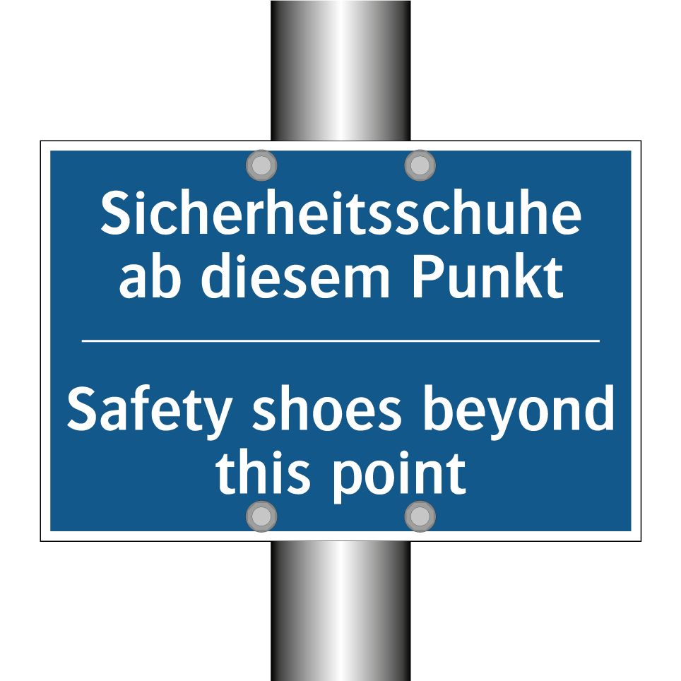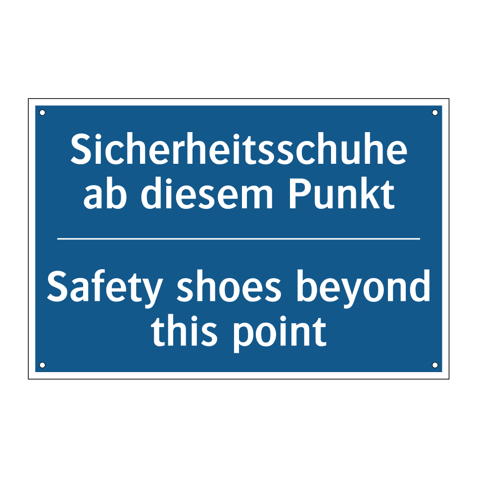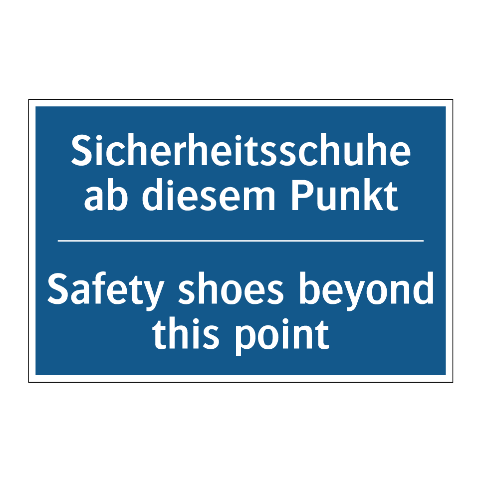 Zweisprachiges Verbotsschild mit deutschem Text Sicherheitsschuhe ab diesem Punkt und englischem Text Safety shoes beyond this point
