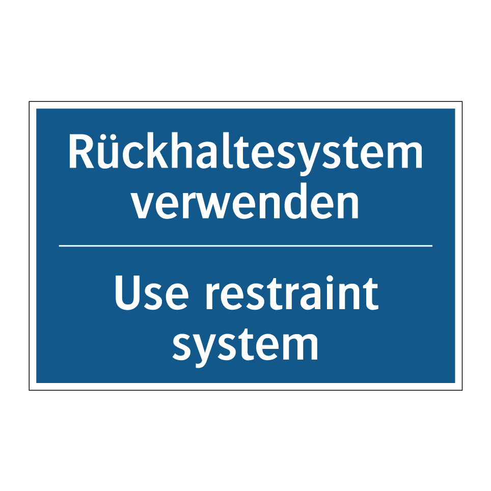 Zweisprachiges Verbotsschild mit deutschem Text Rückhaltesystem verwenden und englischem Text Use restraint system