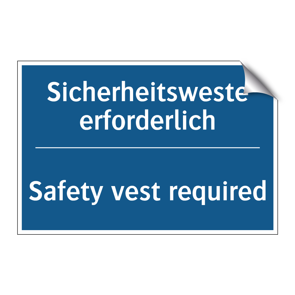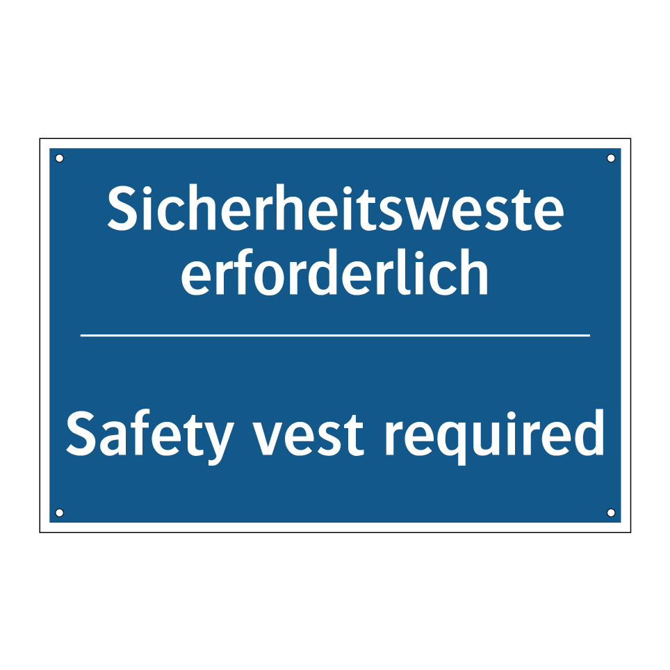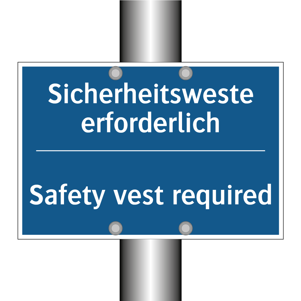 Zweisprachiges Verbotsschild mit deutschem Text Sicherheitsweste erforderlich und englischem Text Safety vest required