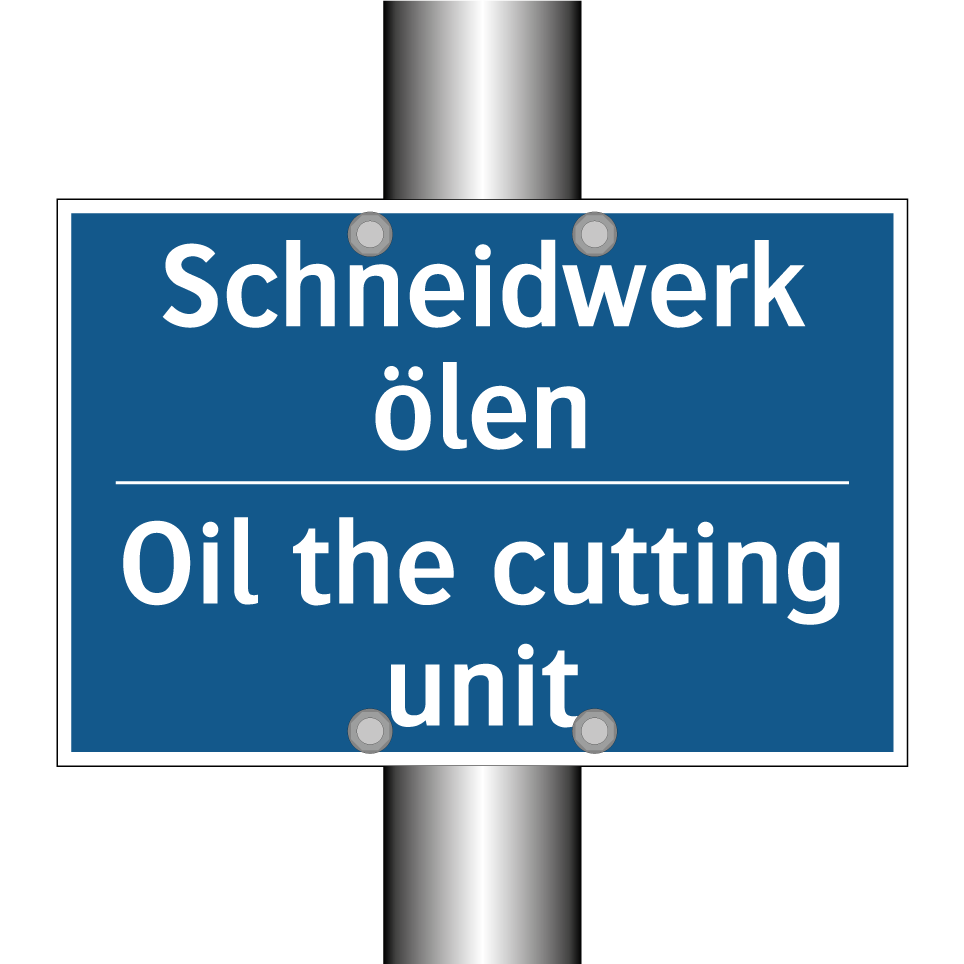 Zweisprachiges Verbotsschild mit deutschem Text Schneidwerk ölen und englischem Text Oil the cutting unit
