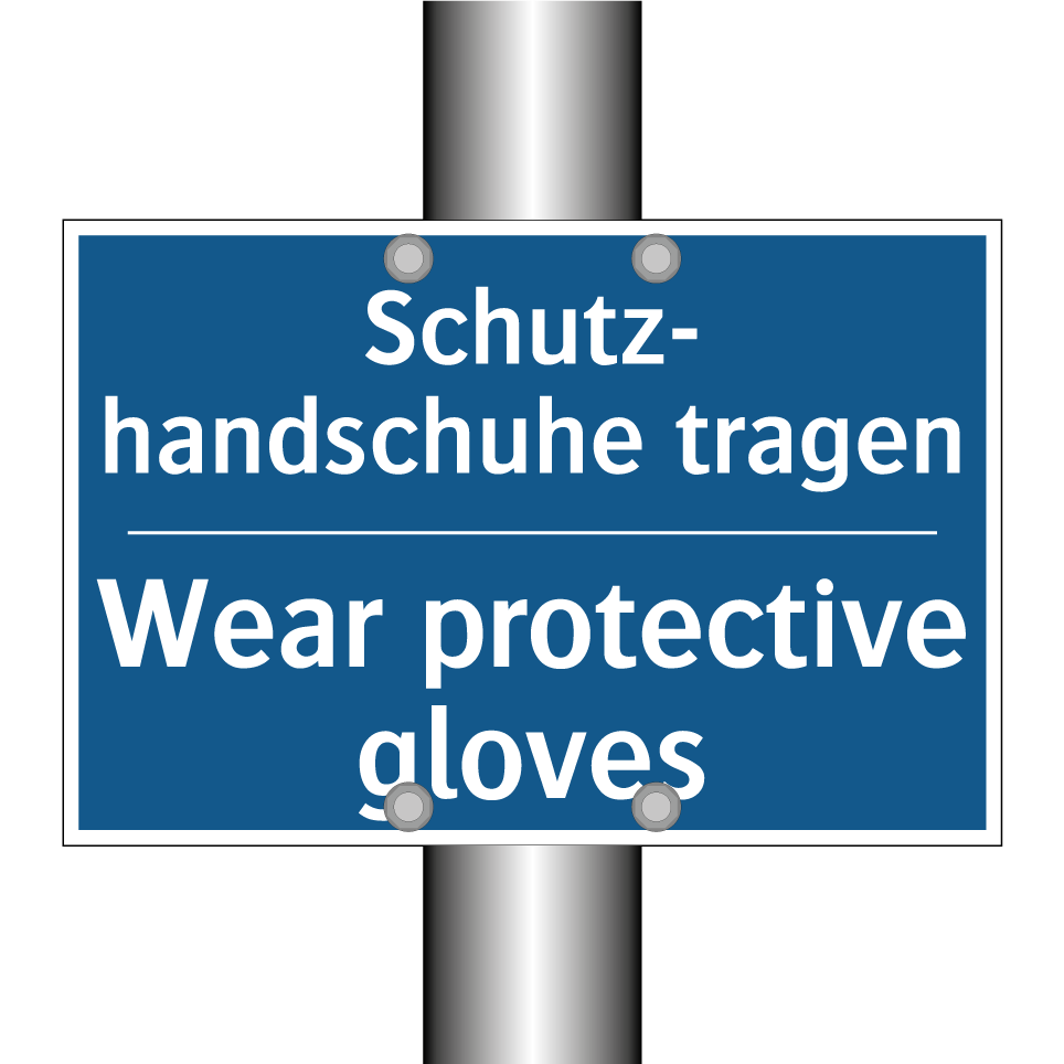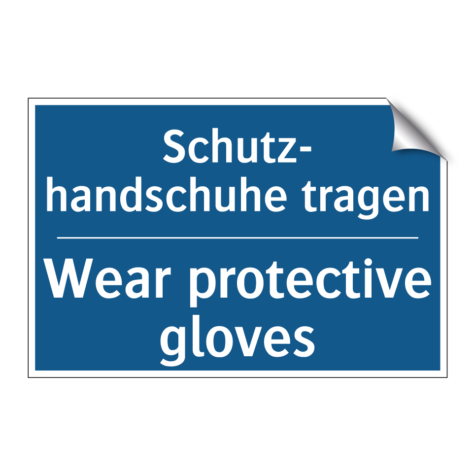 Zweisprachiges Verbotsschild mit deutschem Text Schutz- handschuhe tragen und englischem Text Wear protective gloves