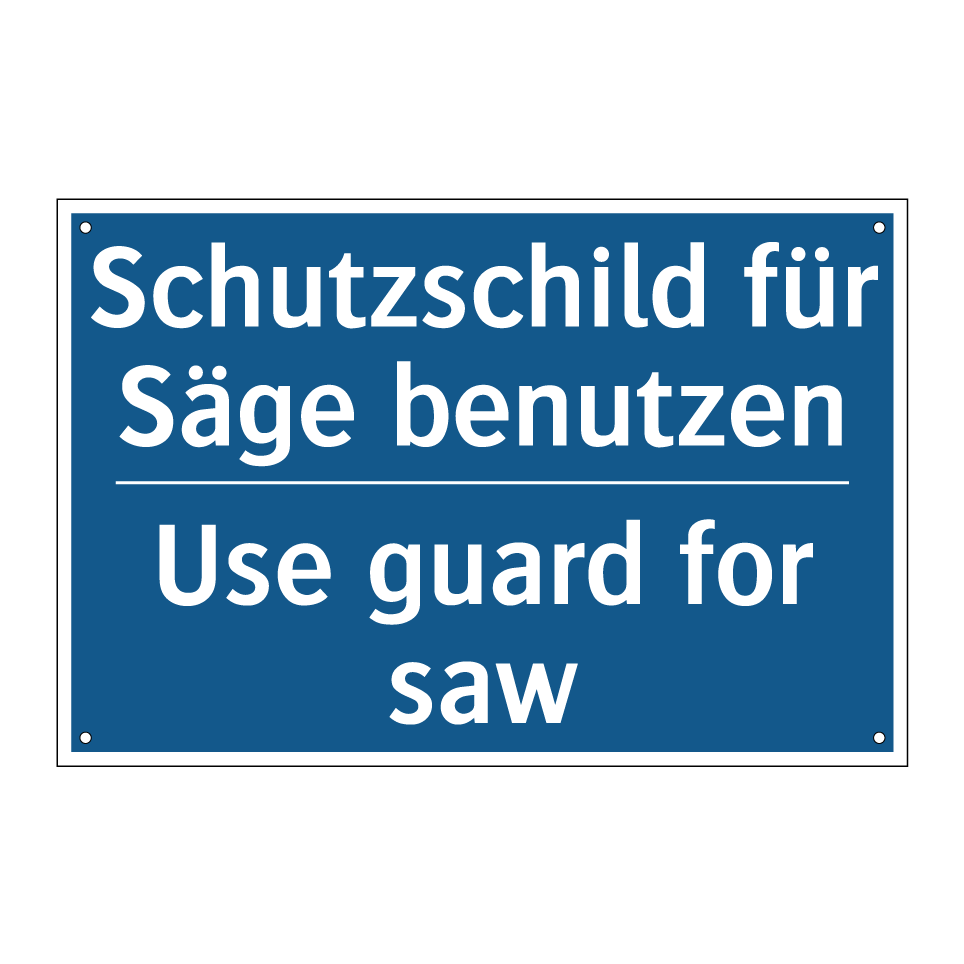 Zweisprachiges Verbotsschild mit deutschem Text Schutzschild für Säge benutzen und englischem Text Use guard for saw