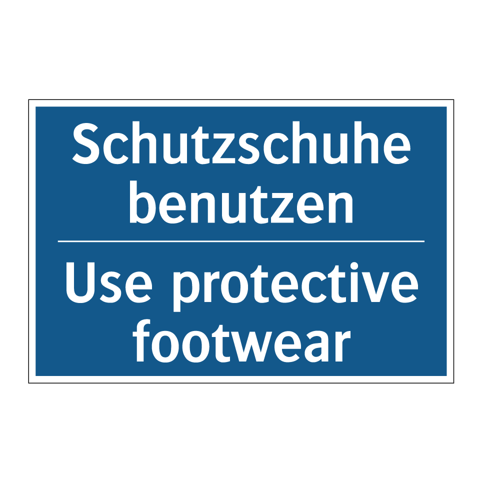 Zweisprachiges Verbotsschild mit deutschem Text Schutzschuhe benutzen und englischem Text Use protective footwear
