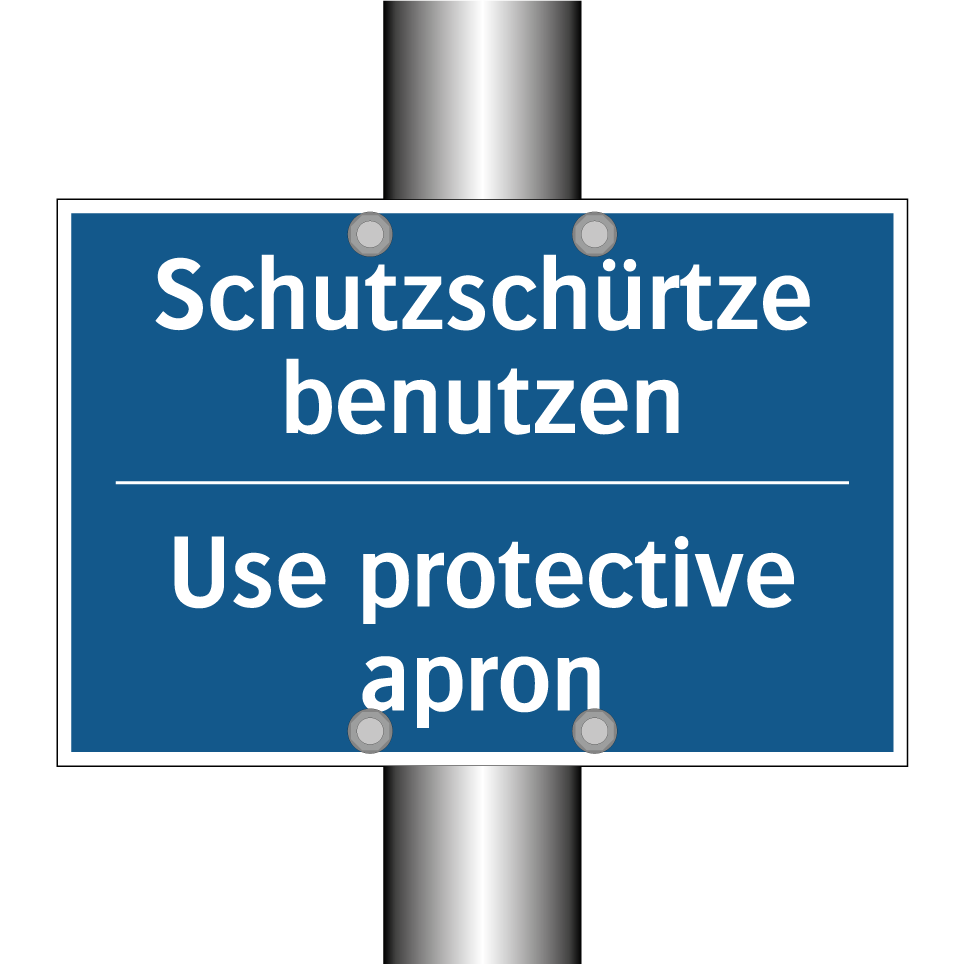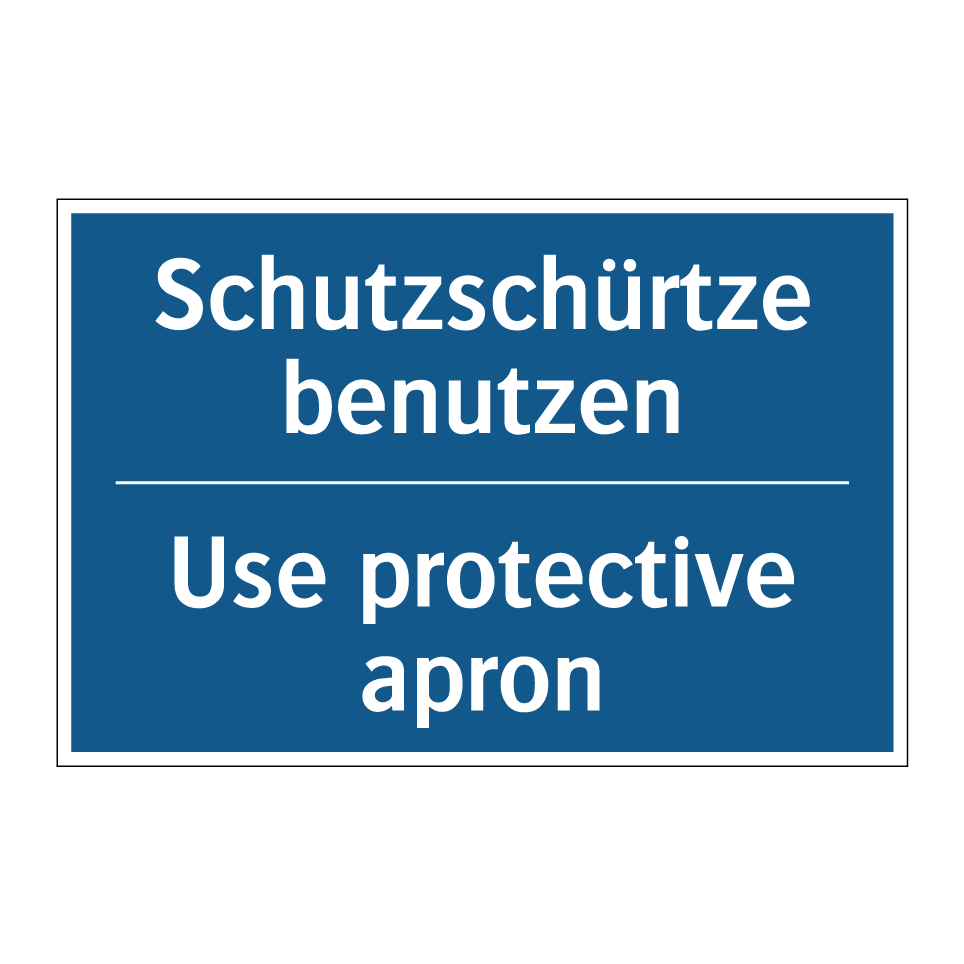 Zweisprachiges Verbotsschild mit deutschem Text Schutzschürtze benutzen und englischem Text Use protective apron