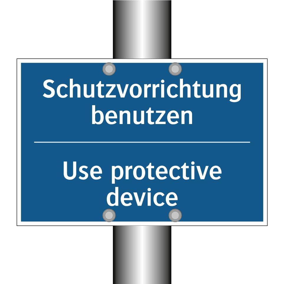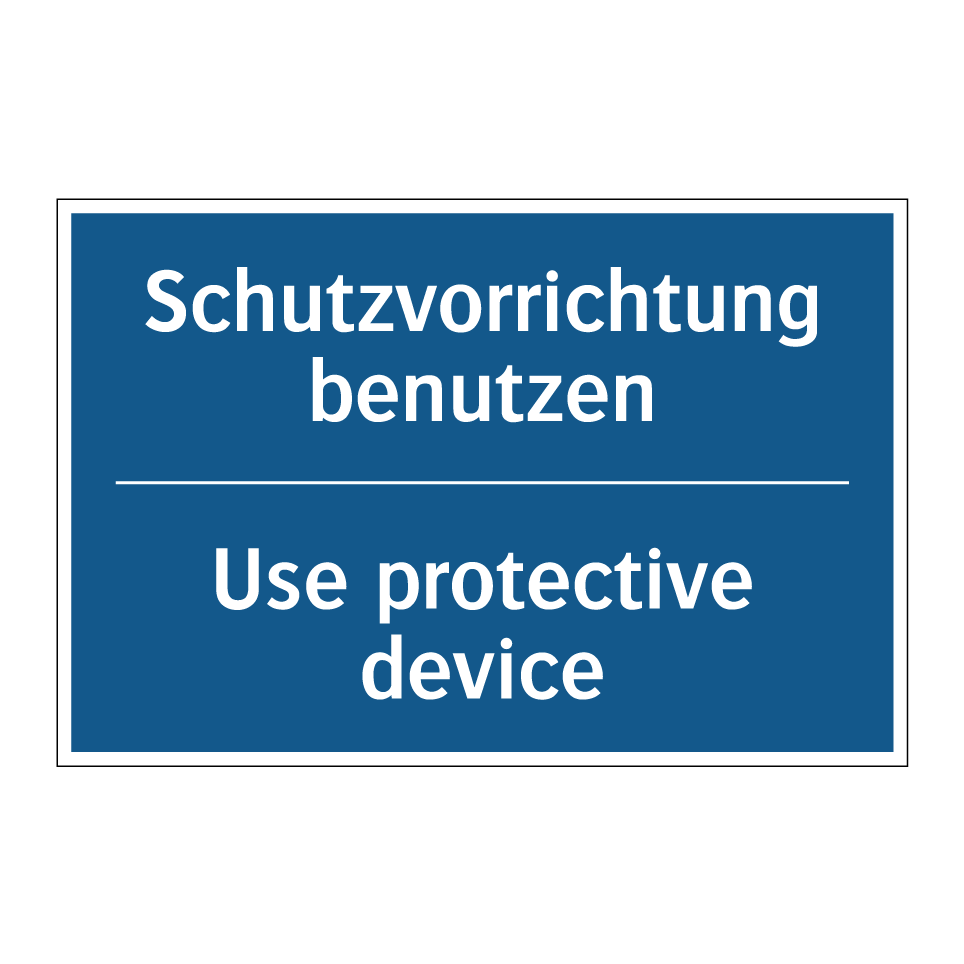 Zweisprachiges Verbotsschild mit deutschem Text Schutzvorrichtung benutzen und englischem Text Use protective device