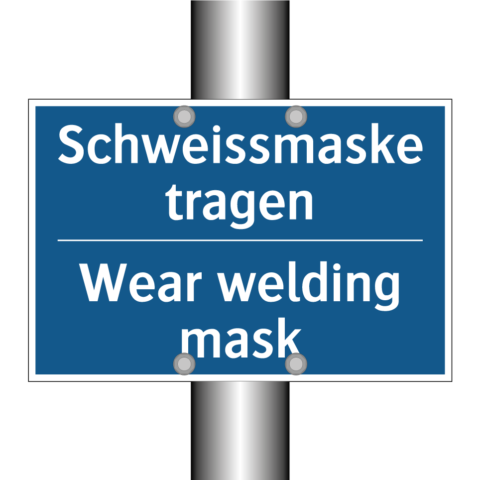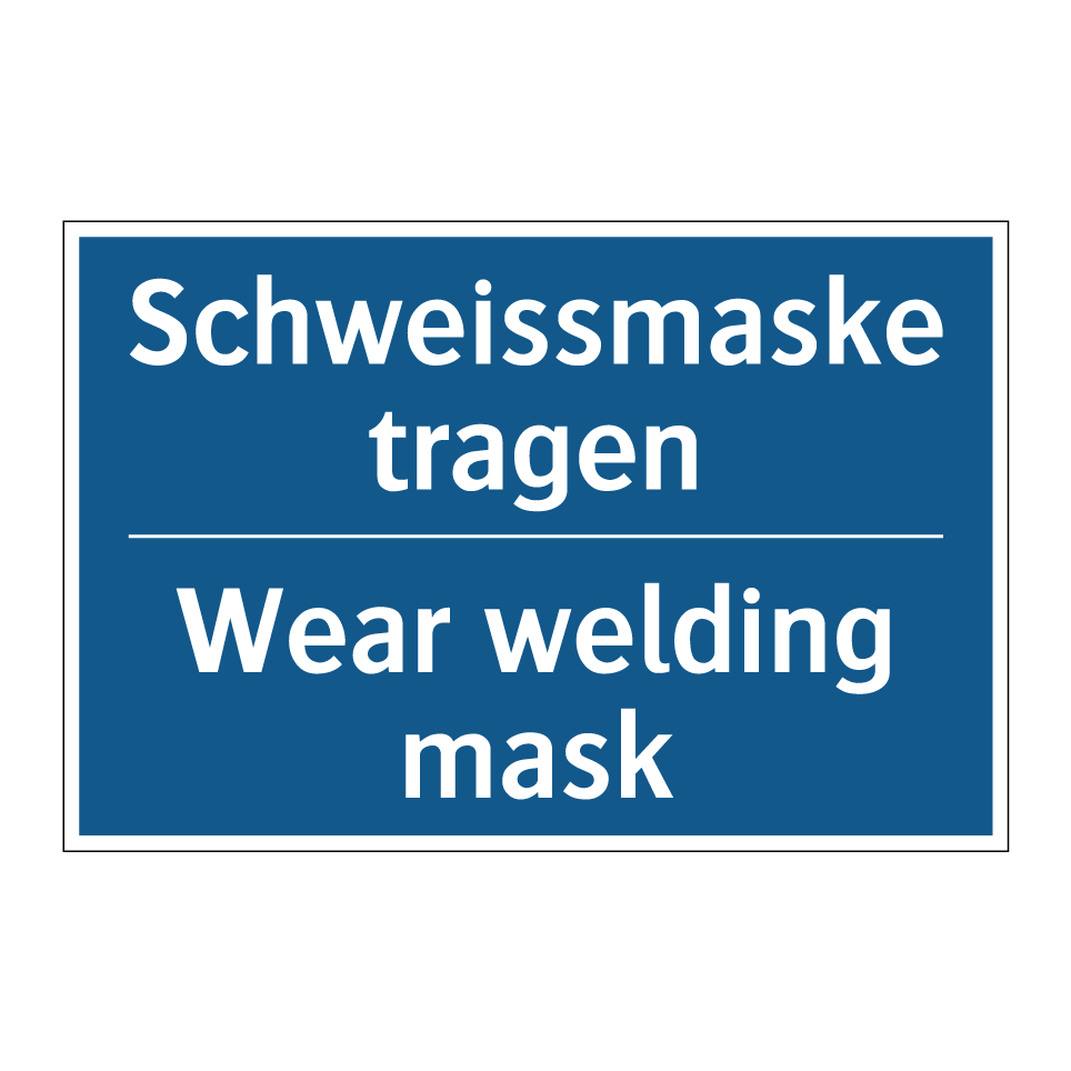 Zweisprachiges Verbotsschild mit deutschem Text Schweissmaske tragen und englischem Text Wear welding mask