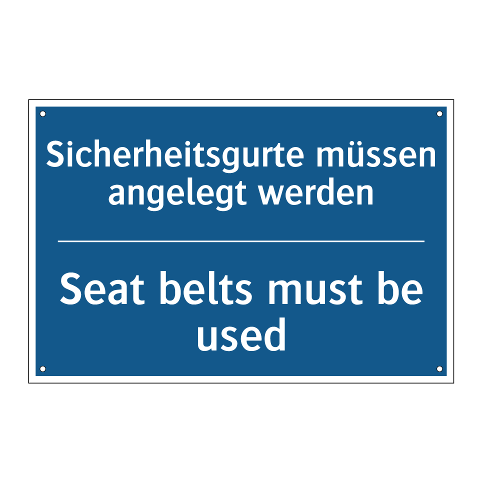 Zweisprachiges Verbotsschild mit deutschem Text Sicherheitsgurte müssen angelegt werden und englischem Text Seat belts must be used
