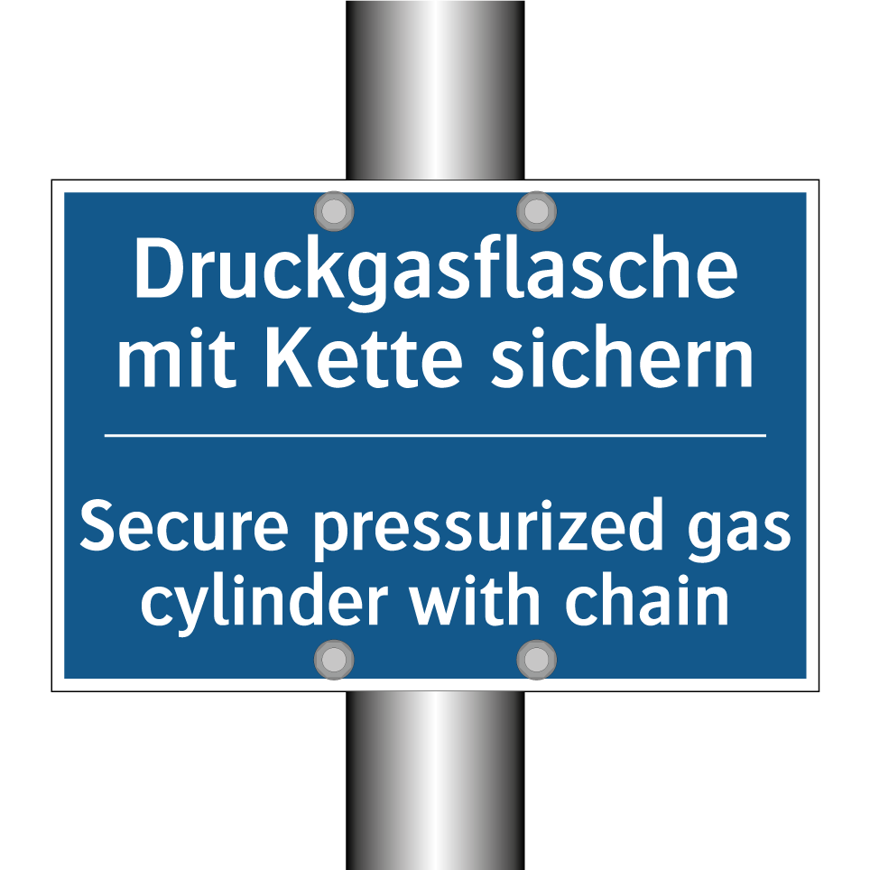 Diese Gebotsschild ist ideal für den Einsatz in Bereichen, in denen Druckgasflaschen verwendet werden. Mit ihrer klaren blauen Hintergrundfarbe und der deutlichen weißen Schrift sorgt sie für sofortige Aufmerksamkeit und klare Anweisungen. Die zweisprachige Beschriftung auf Deutsch und Englisch macht sie besonders nützlich in internationalen Umgebungen, wie zum Beispiel in Laboren, Werkstätten oder industriellen Anlagen. Die Anweisung, Gasflaschen mit einer Kette zu sichern, trägt zur Sicherheit bei und minimiert Unfallrisiken. Diese Gebotsschild kann an Wänden, Türen oder in der Nähe von Lagerbereichen für Gasflaschen angebracht werden, um die Einhaltung von Sicherheitsvorschriften zu gewährleisten.